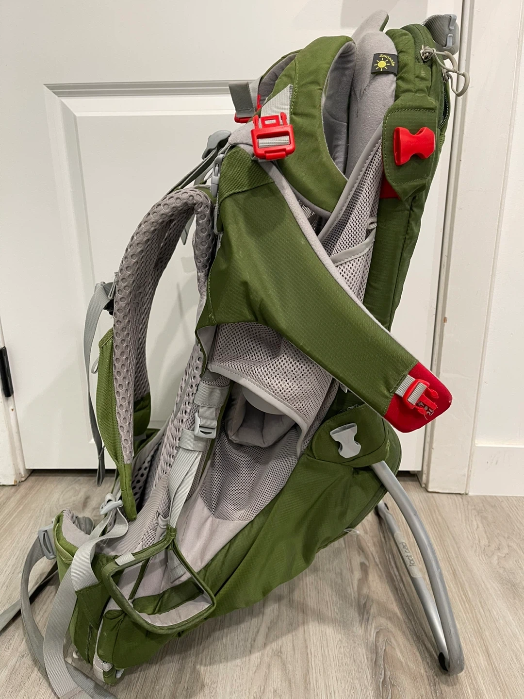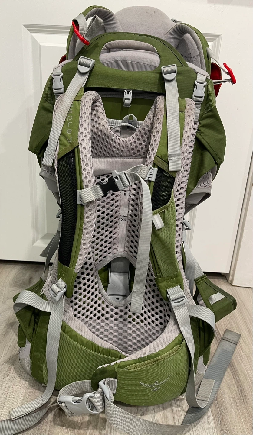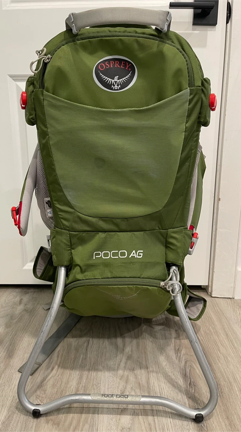 Osprey Poco AG child carrier backpack in green. Built-in sunshade and adjustable harness. This carrier is great for hikes and trips with little ones!