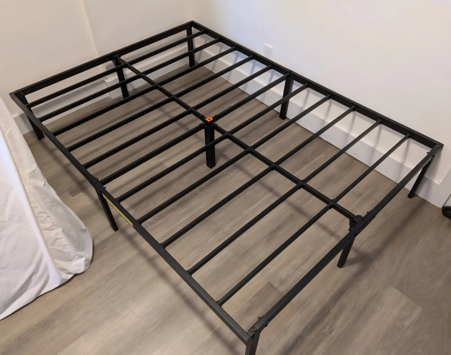 Sturdy black metal bed frame, ready for assembly. This platform bed frame offers a strong foundation for your mattress. Simple construction, easy to put together!
