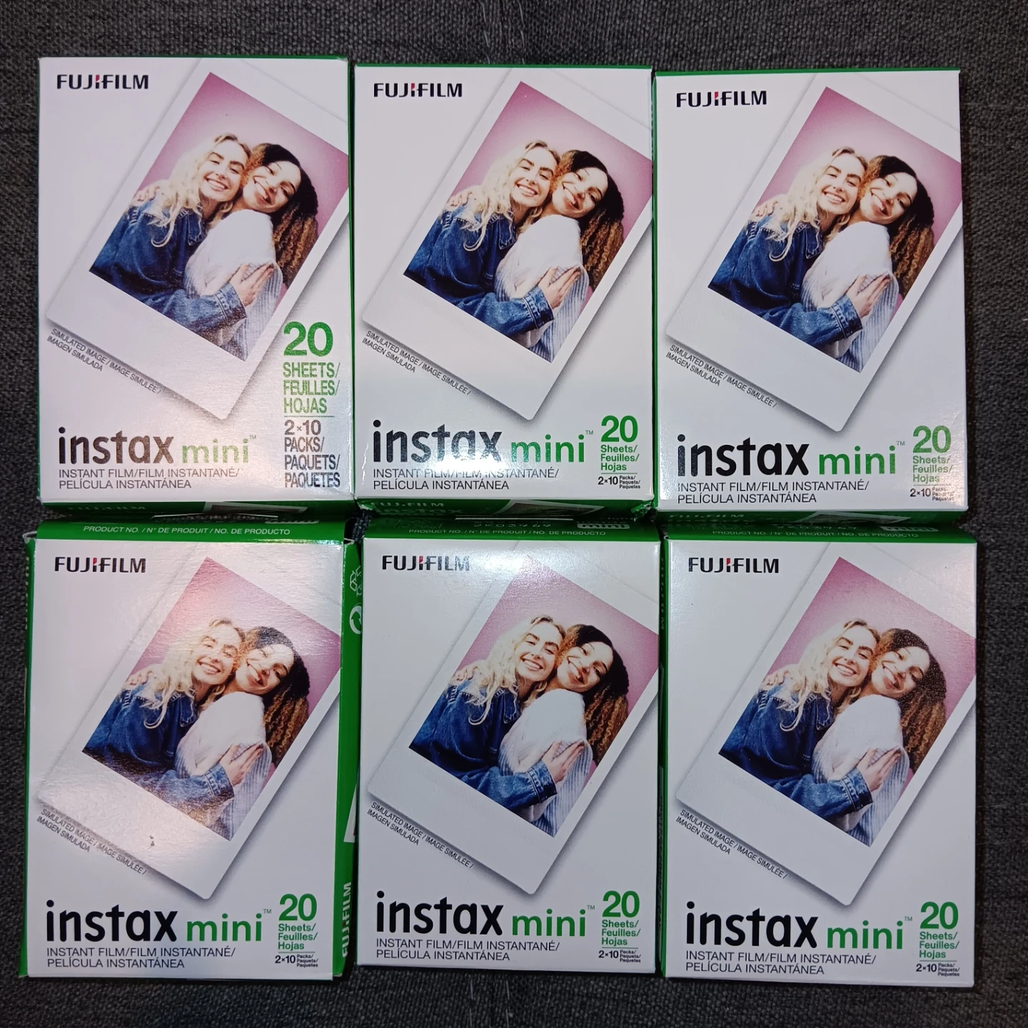 6 x 20 packs of Fujifilm Instax Mini film. Each box contains 20 sheets for a total of 120 sheets. Expiry dates range from 2026-05 to 2027-08.