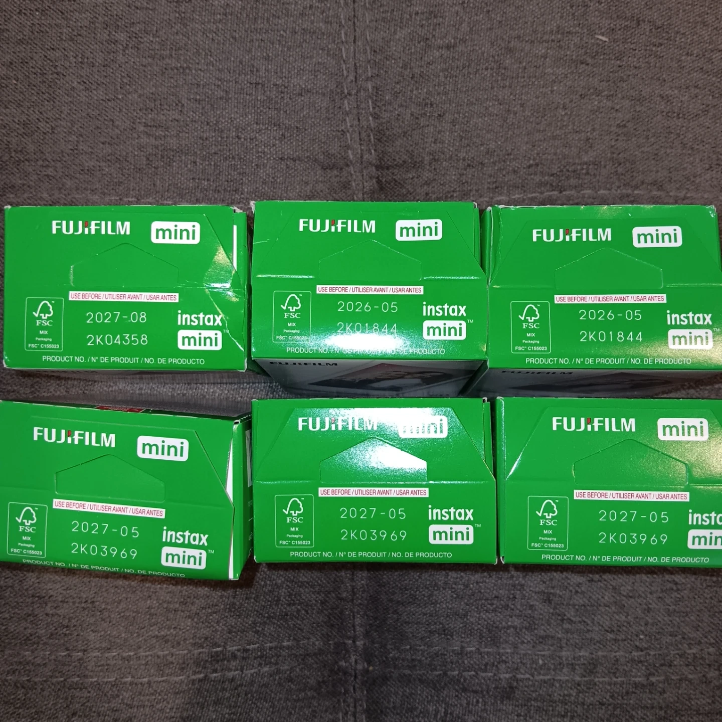 6 x 20 packs of Fujifilm Instax Mini film. Each box contains 20 sheets for a total of 120 sheets. Expiry dates range from 2026-05 to 2027-08.