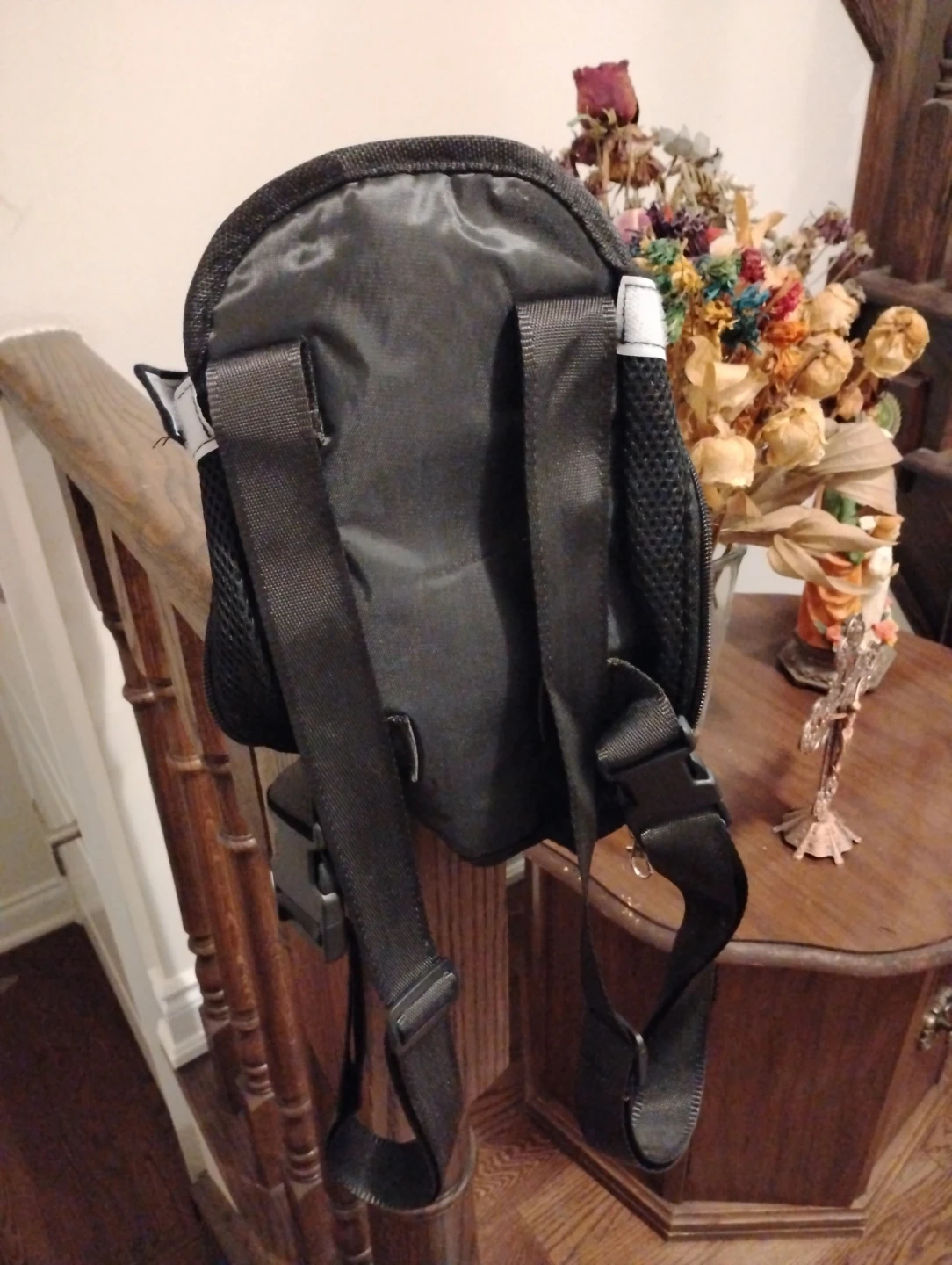 This black mesh pet carrier backpack is designed for small pets mini size . It features adjustable straps for a secure fit and breathable mesh for comfort. The backpack has openings for your pet's head and legs. It's suitable for carrying small dogs or cats on the go.