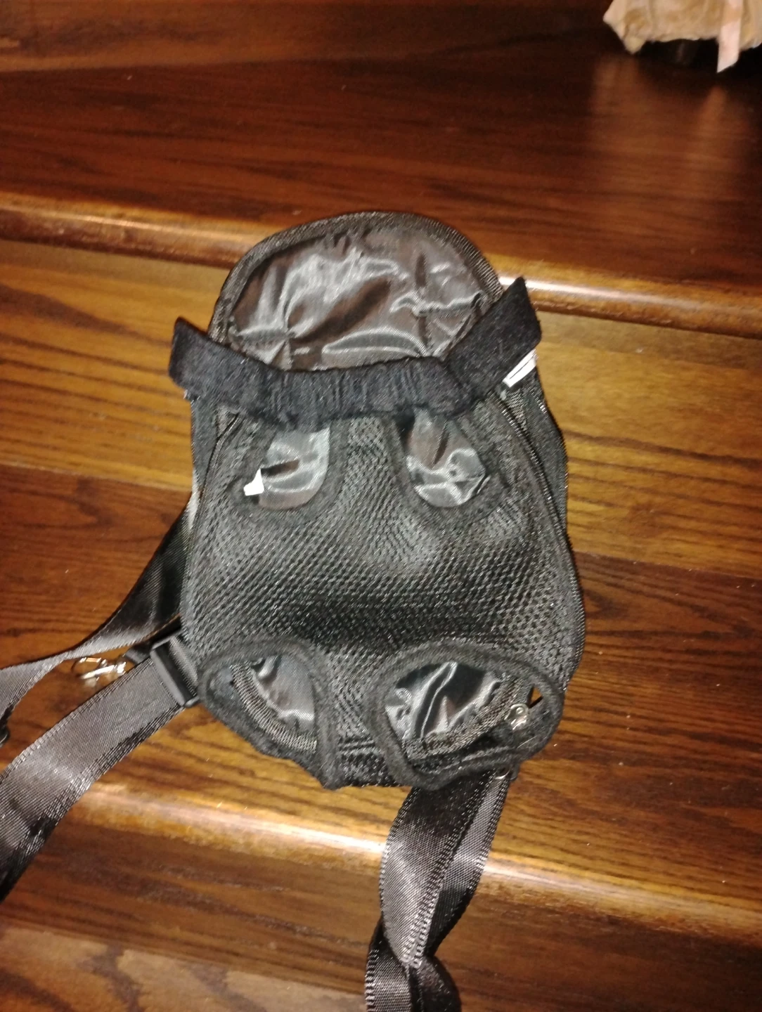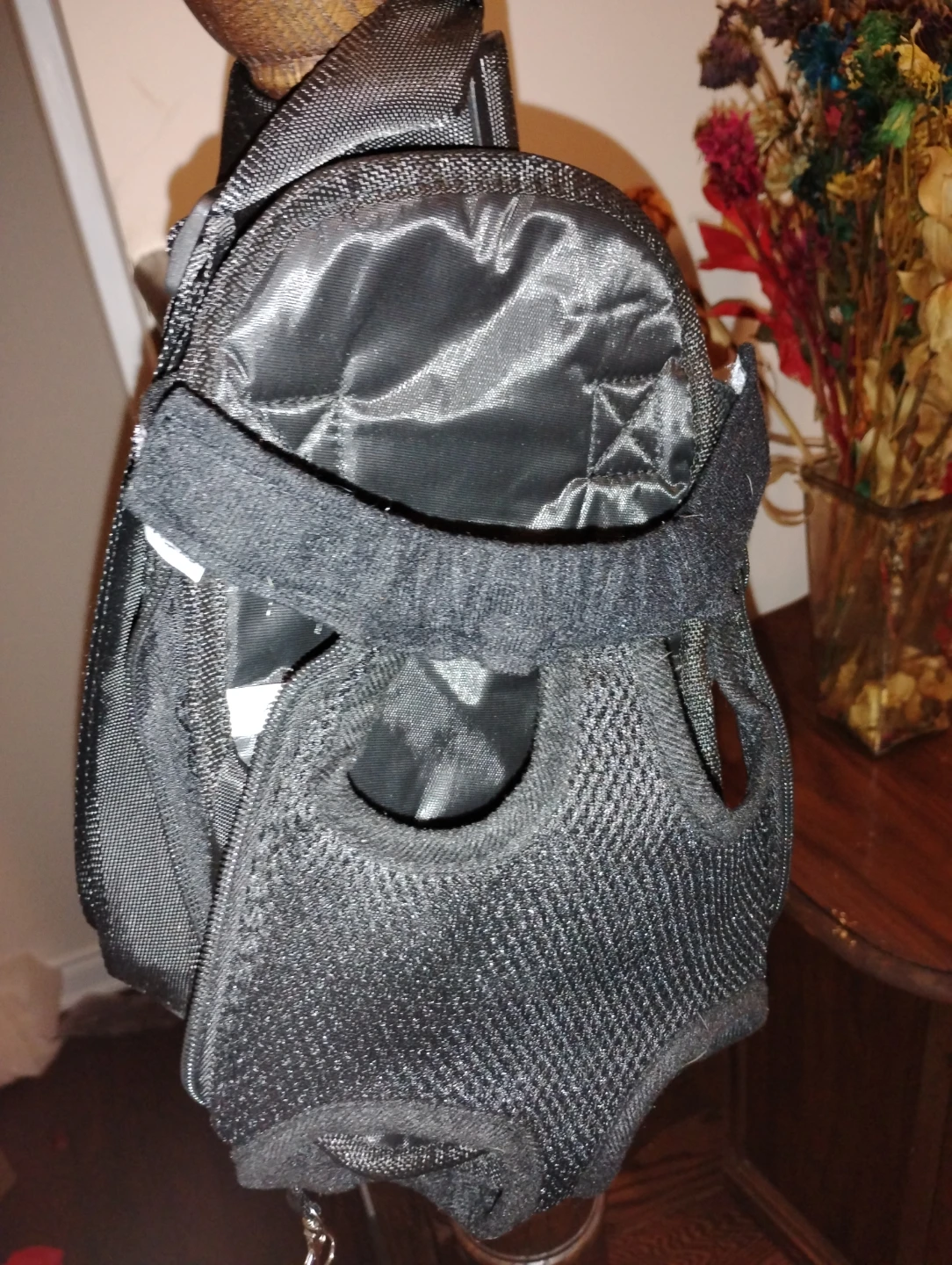 This black mesh pet carrier backpack is designed for small pets mini size . It features adjustable straps for a secure fit and breathable mesh for comfort. The backpack has openings for your pet's head and legs. It's suitable for carrying small dogs or cats on the go.