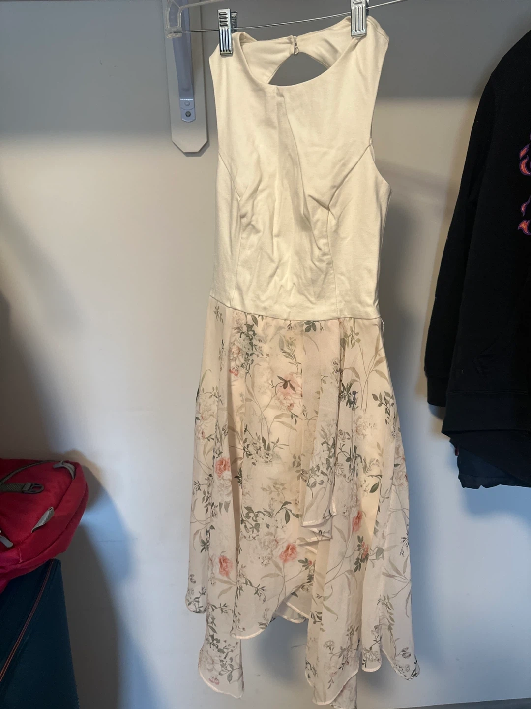 A cream sleeveless dress with a lovely floral print on the skirt. It features a high neckline and a keyhole back detail. This dress has a flowy, handkerchief hem.