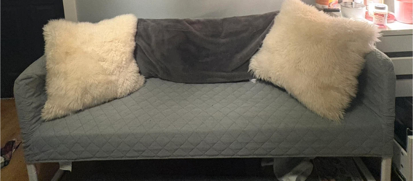 Grey quilted loveseat sofa. It has two fluffy cream-coloured cushions and a dark grey throw blanket. The sofa is upholstered in a textured grey fabric and features a diamond-stitched pattern. Perfect for a cozy seating area!