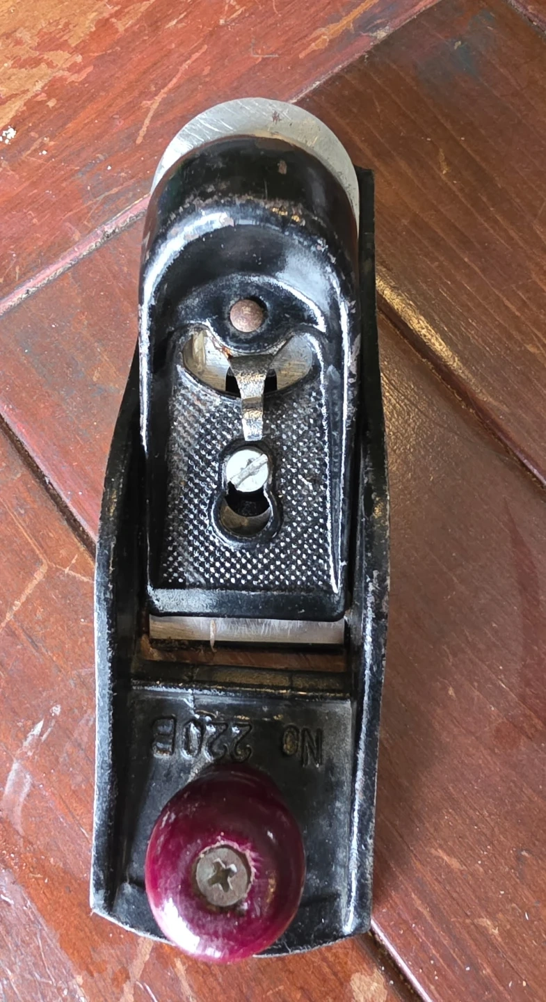 This is a vintage hand plane with a black painted body and a red knob. It's marked "No. 220B" on the side. This tool is great for woodworking and shaping small pieces of wood. It's made for fine detail work.