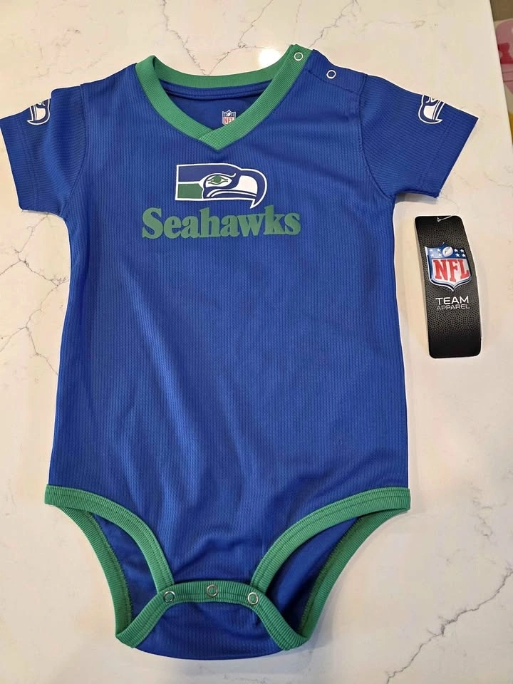 Brand new Seattle Seahawks baby onesie (18–24 months), never worn and still with tags. Official NFL licensed product. Retail price: $24.99 (shown on tag). Great for game days or as a gift for a Seahawks fan. Smoke-free, pet-free home. Pickup in Scarborough- Meadowvale and Ellesmere.