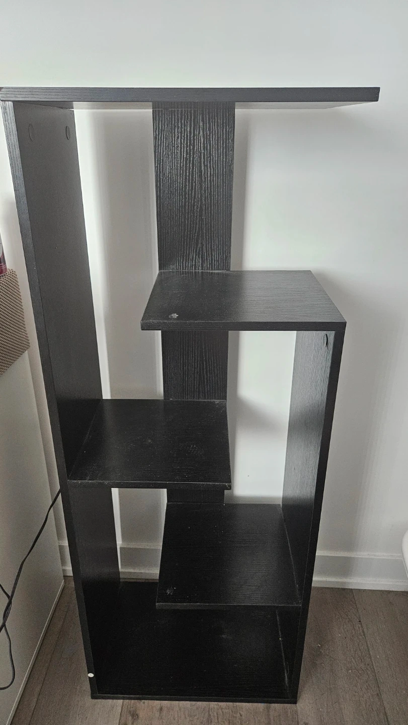 This black wood tiered shelf unit offers multiple levels for storage and display. Its staggered design adds visual interest to any room. Great for organizing books, decor, or plants! Pick up only.