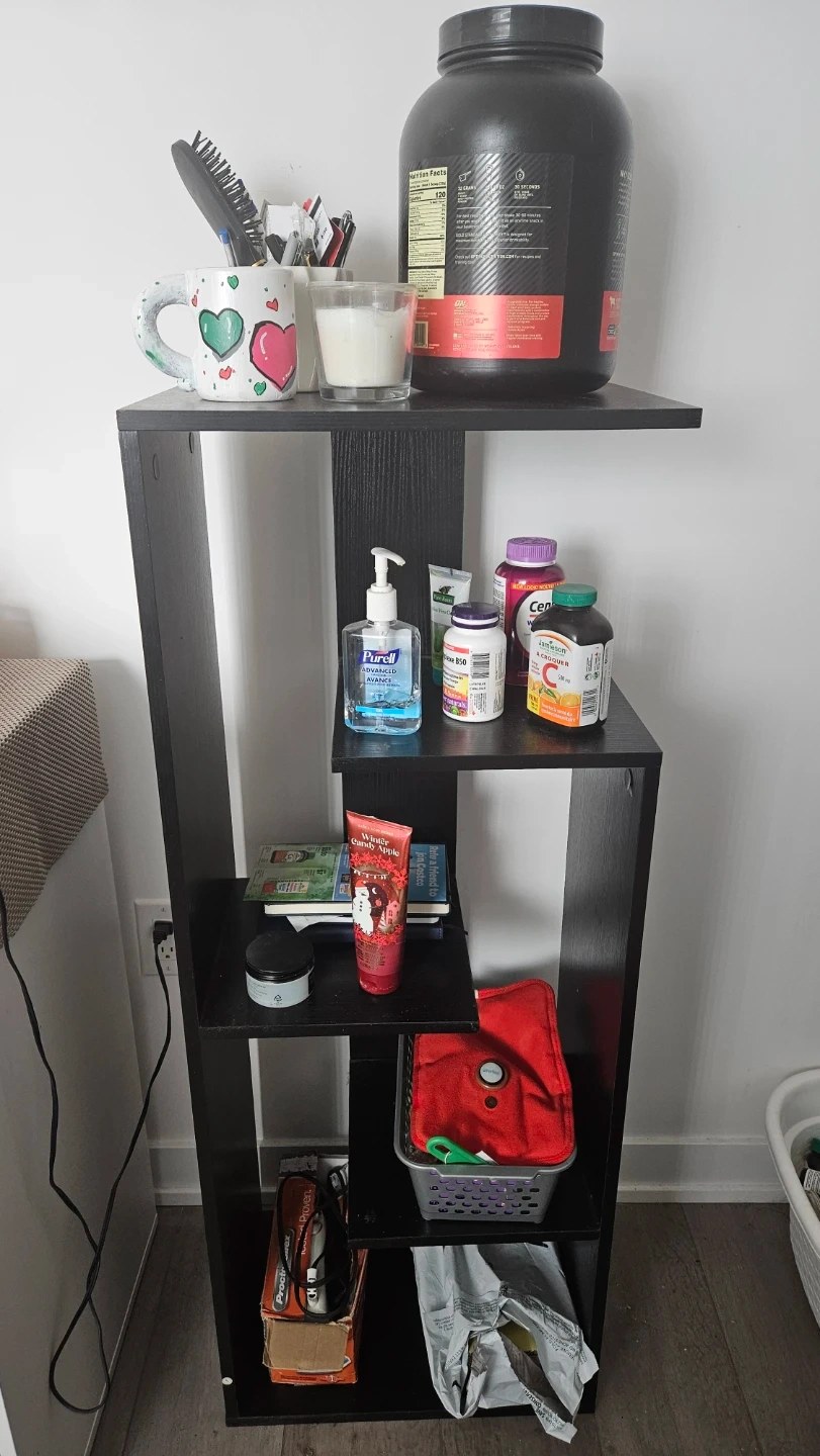 This black wood tiered shelf unit offers multiple levels for storage and display. Its staggered design adds visual interest to any room. Great for organizing books, decor, or plants! Pick up only.