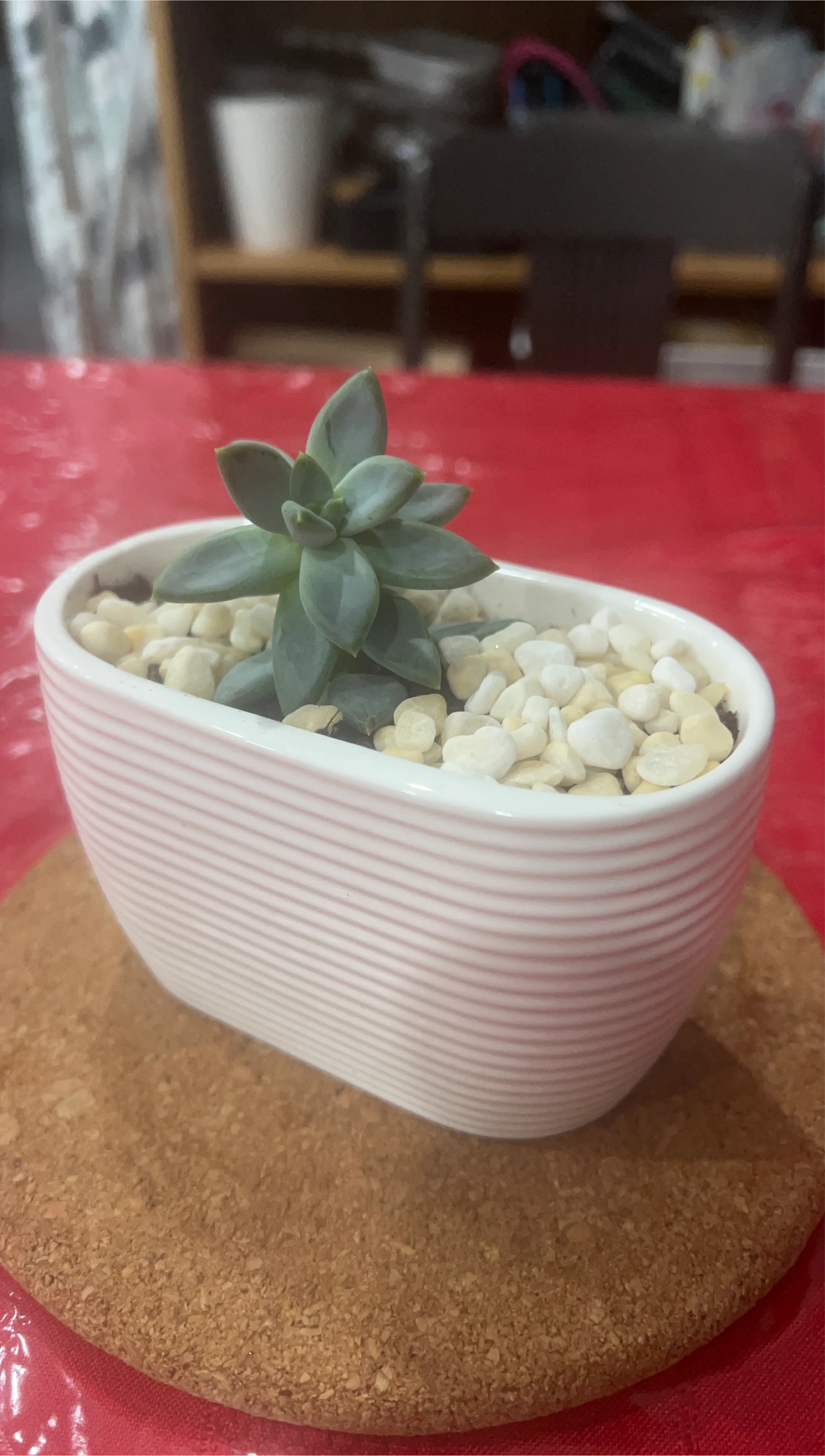 A healthy succulent plant sits in a charming white ceramic pot with subtle pink stripes. It's topped with smooth, light-coloured pebbles. This decorative plant would add a touch of green to any space., office table . Also, can be gifted to anyone, love ones, friends and acquaintances.