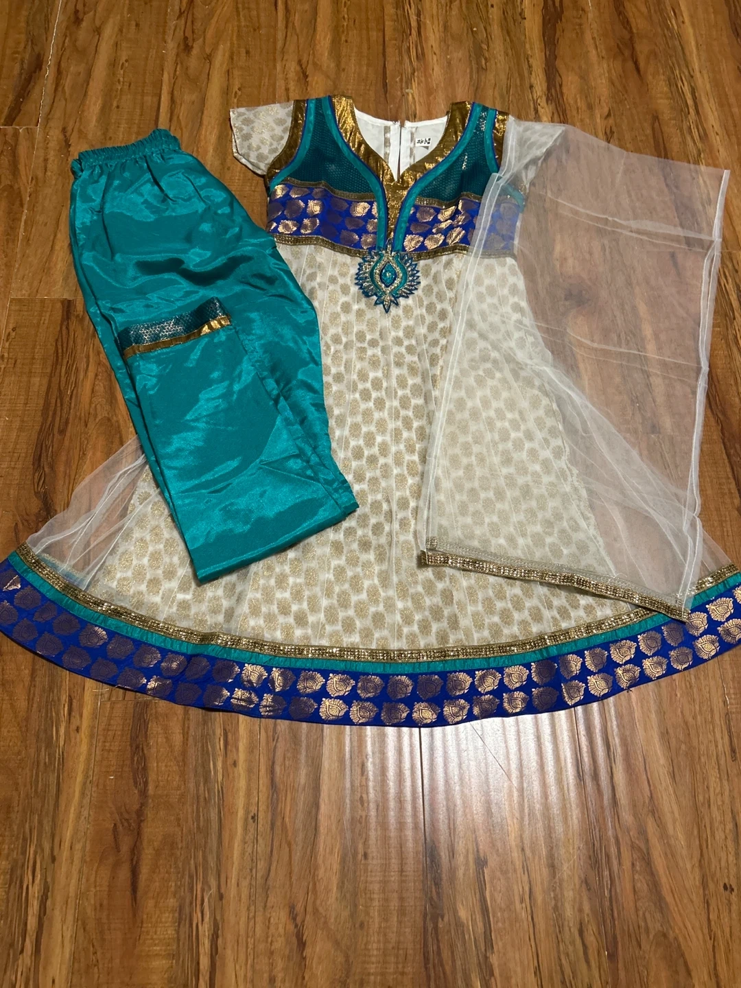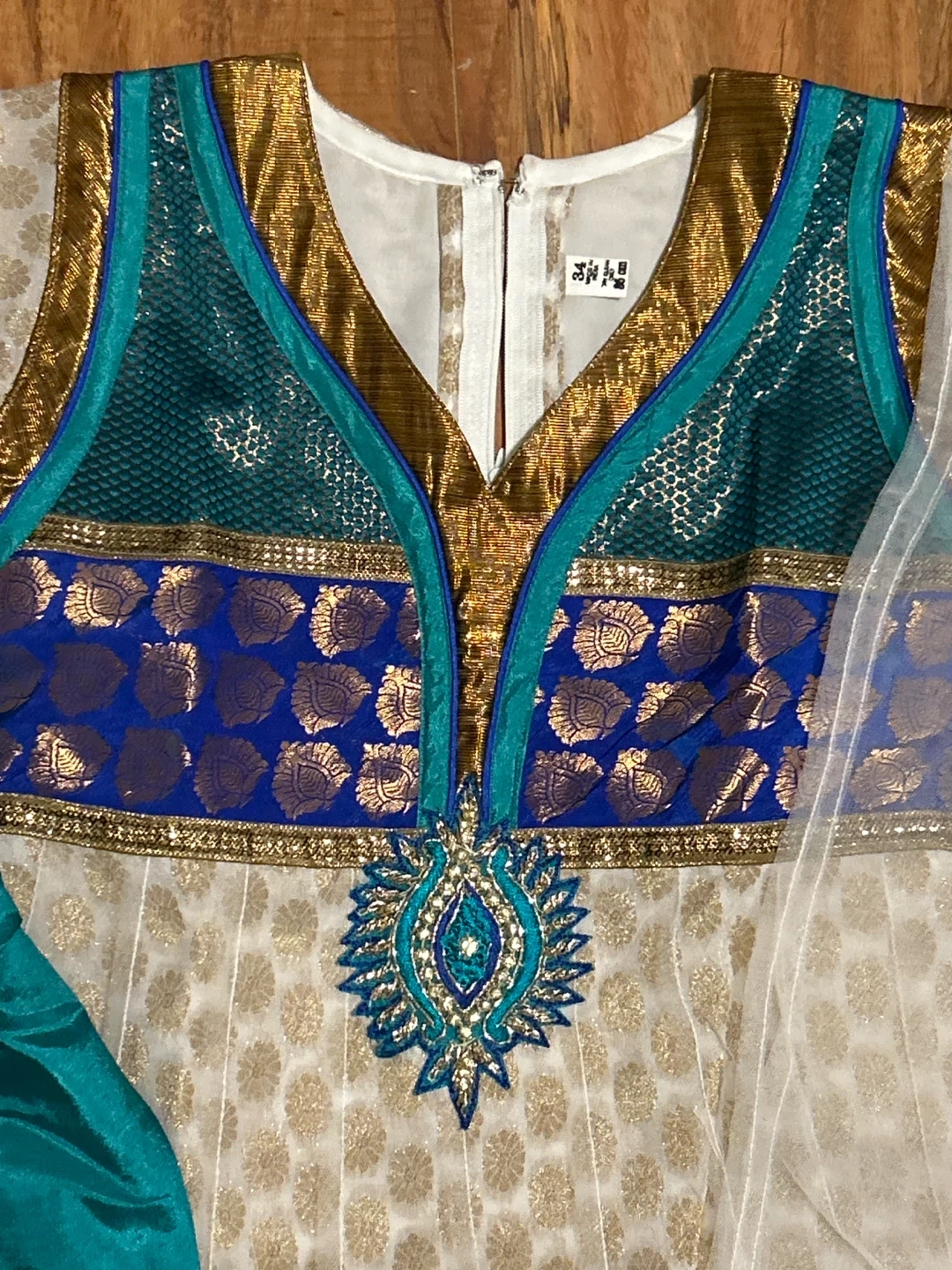 This is a festive girls' kurti set with matching pants and a sheer dupatta. It's adorned with gold thread work and blue and teal accents. The outfit includes a sleeveless kurti, pants, and a dupatta.