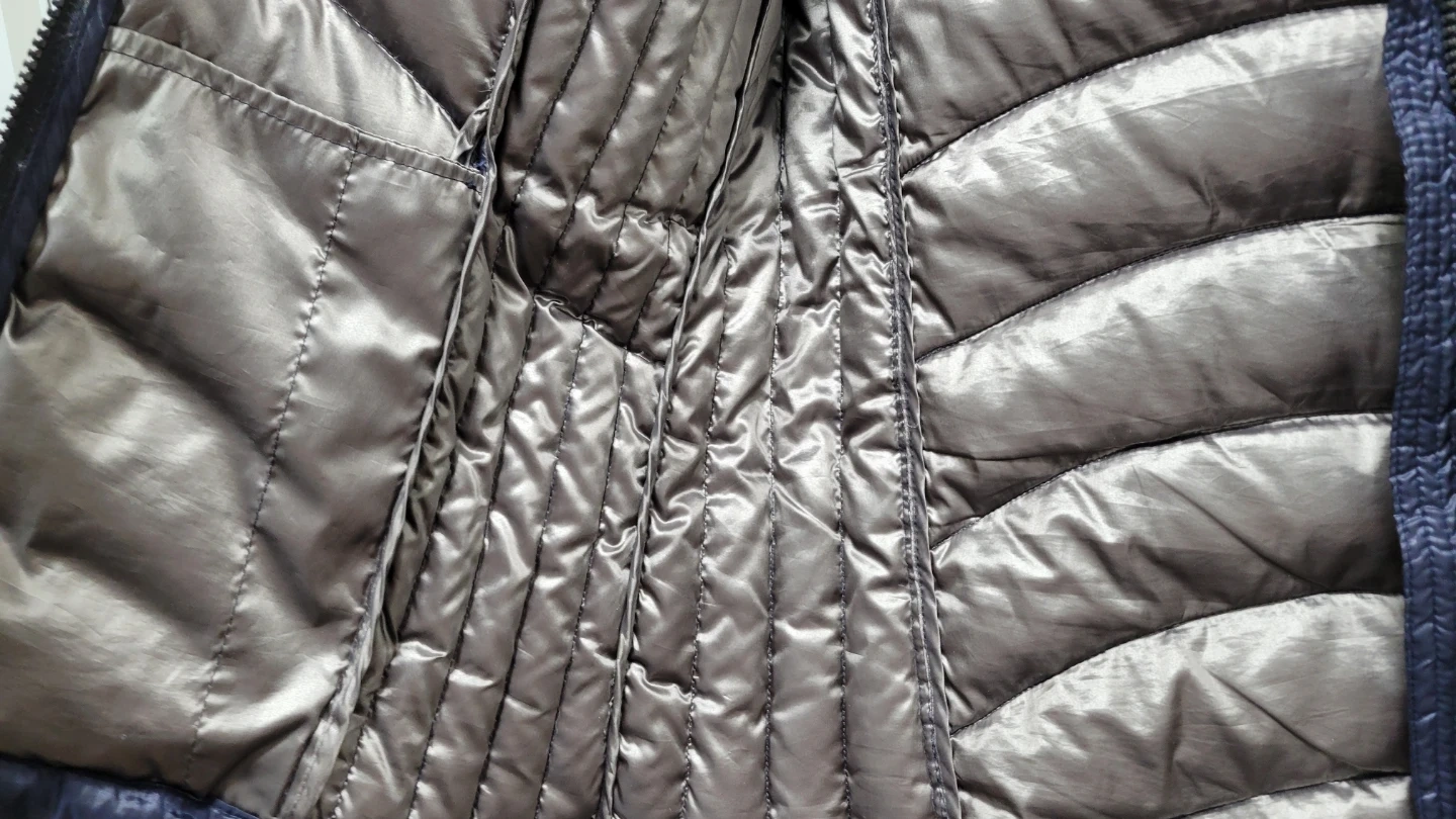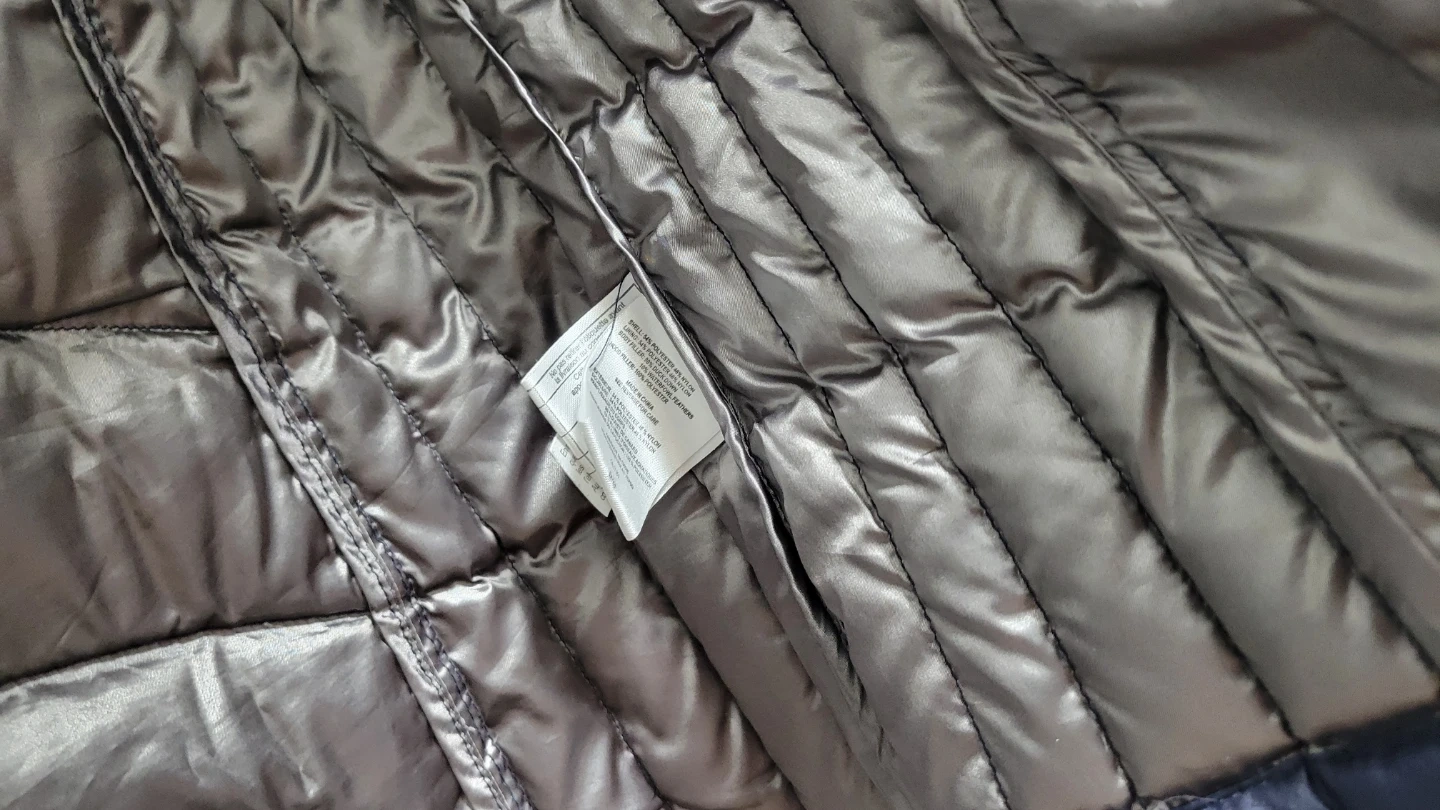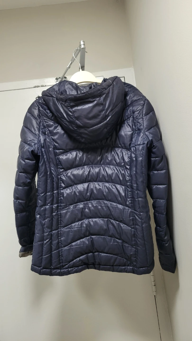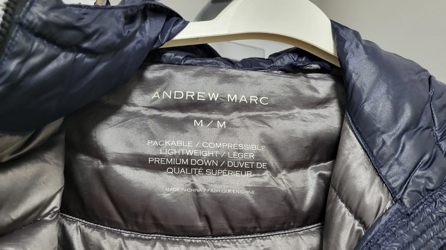Andrew Marc packable down jacket in navy. Lightweight and compressible for easy travel. Made with premium down for superior warmth. It's a size M/M.
