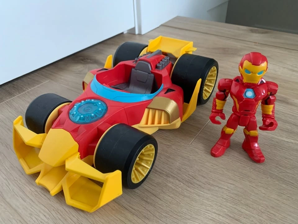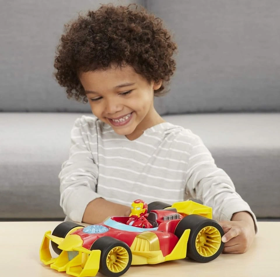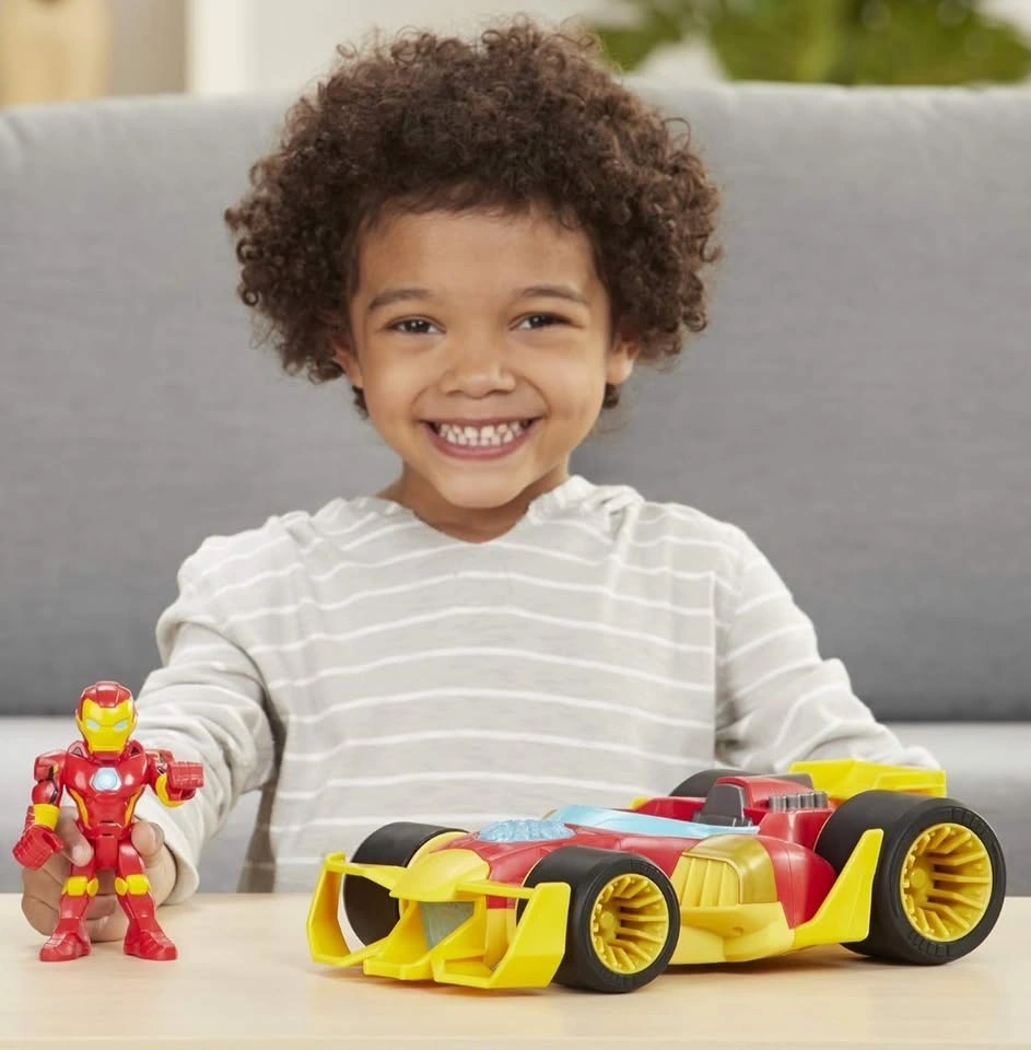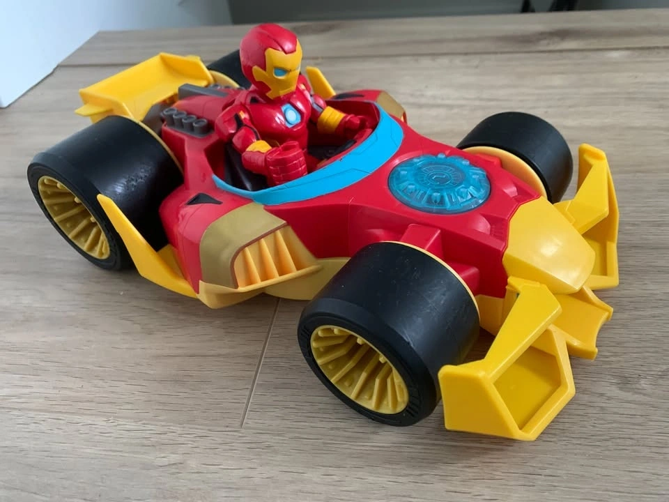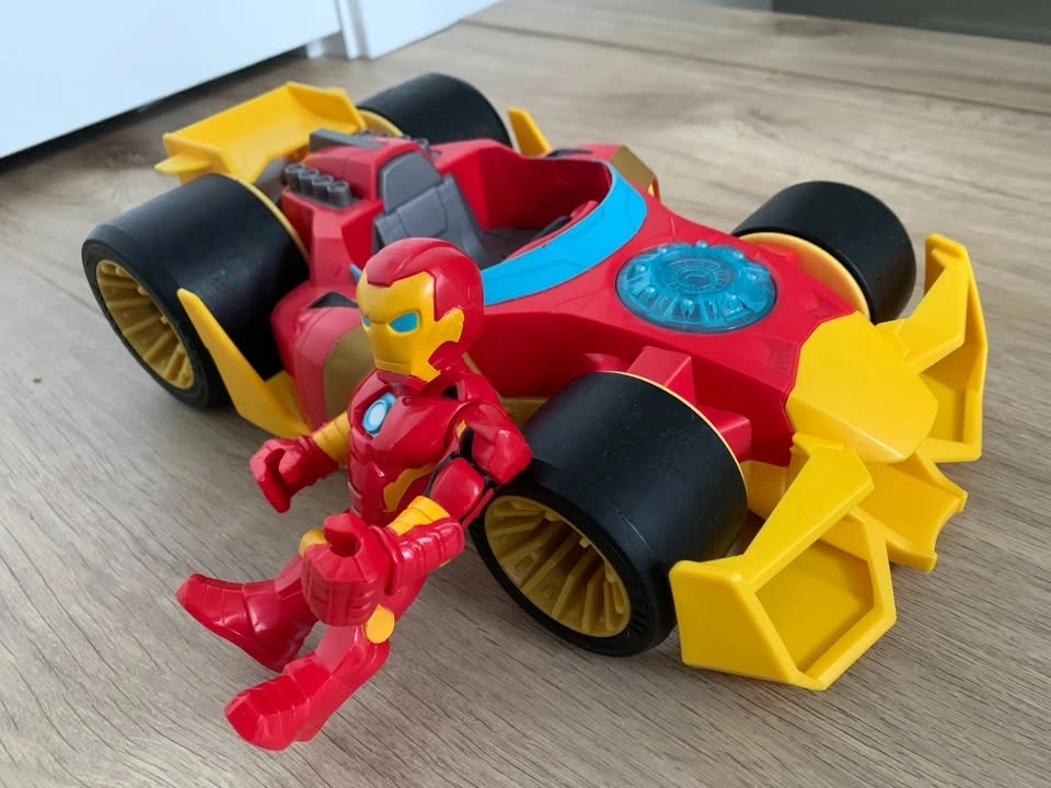 The vehicle has smooth wheels, and the Iron Man figure has a movable head, arms, and legs.