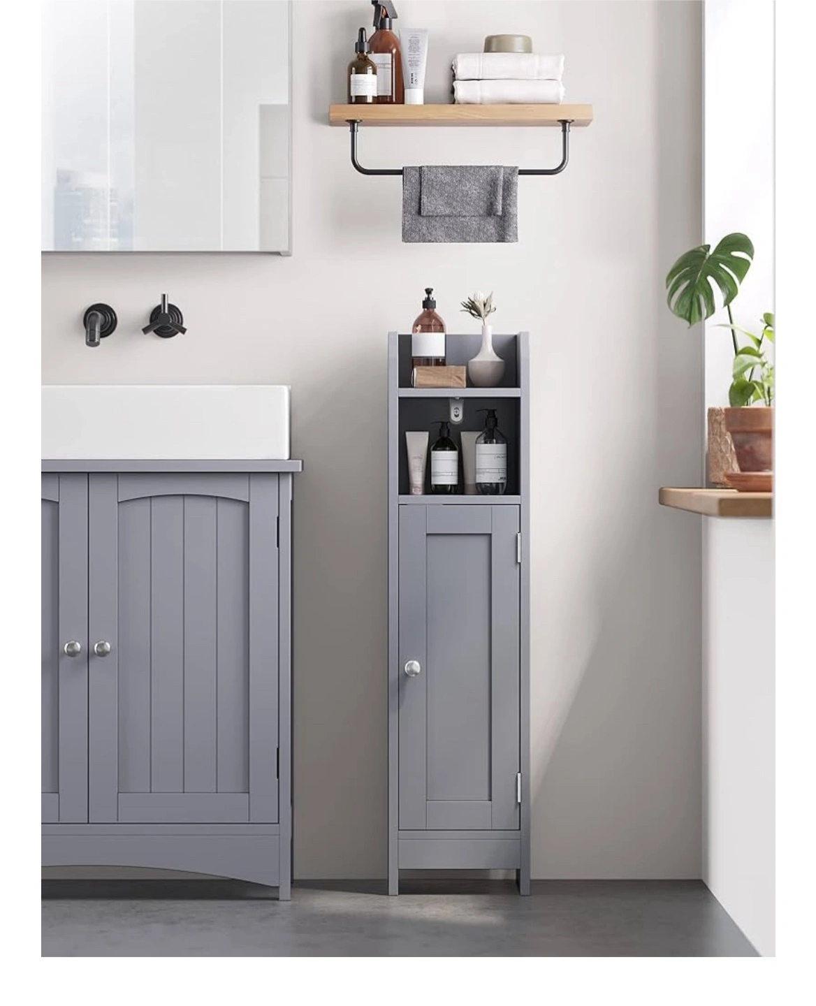 Selling a like-new VASAGLE bathroom cabinet! It's a slim cabinet perfect for adding some extra storage to your bathroom. The shelves inside are height adjustable or even removable to fit various items. It's grey and comes with the box!