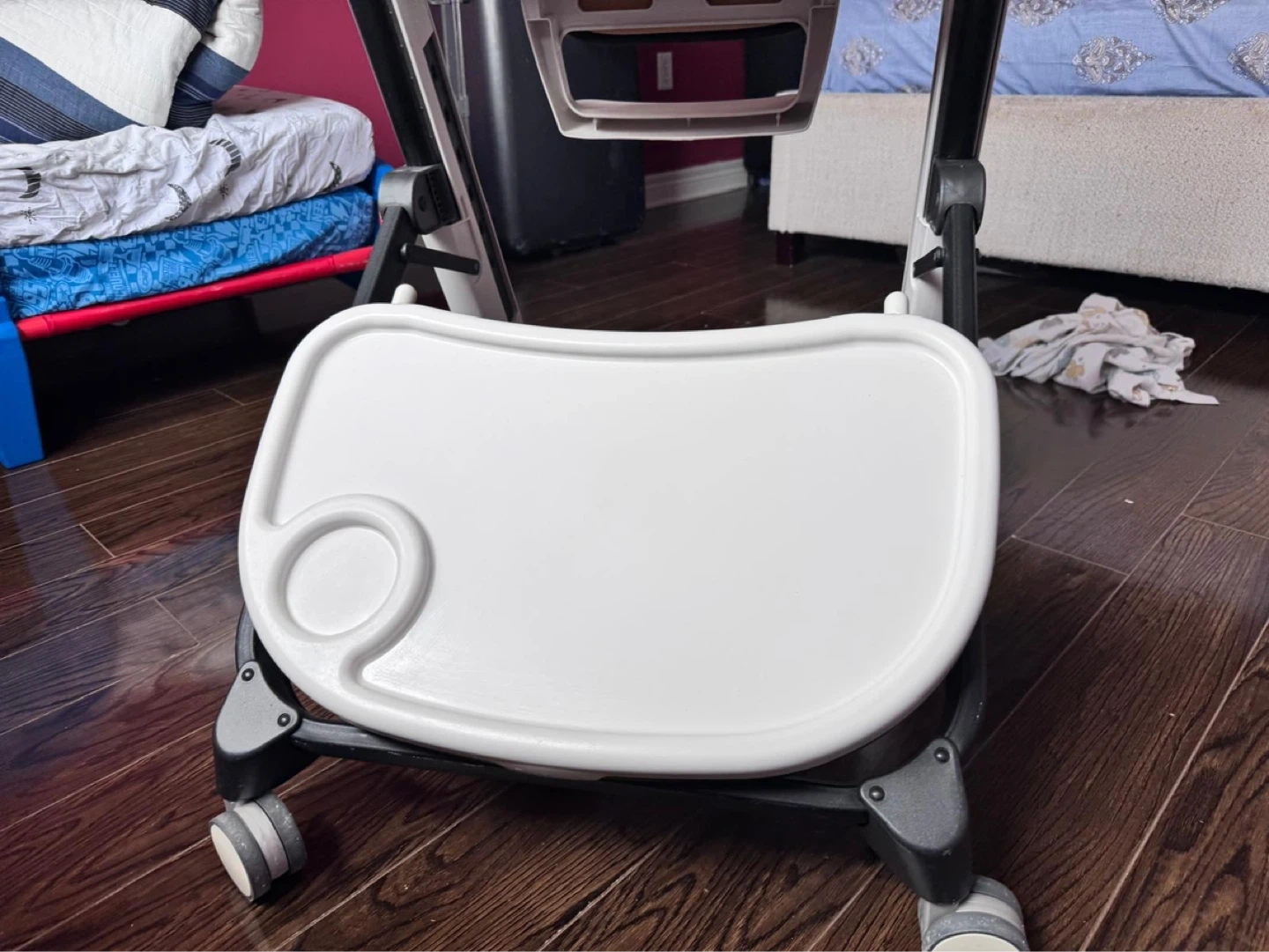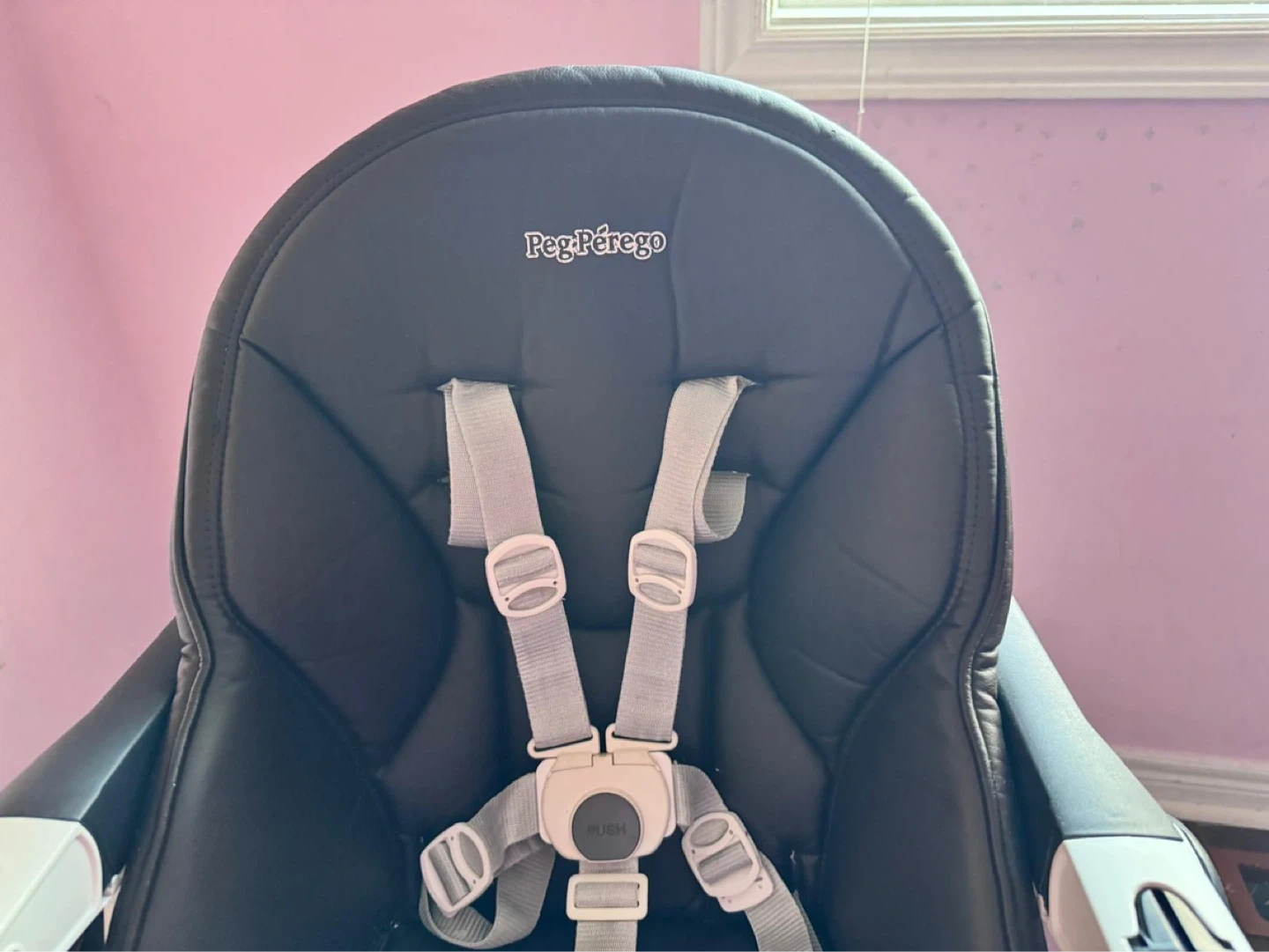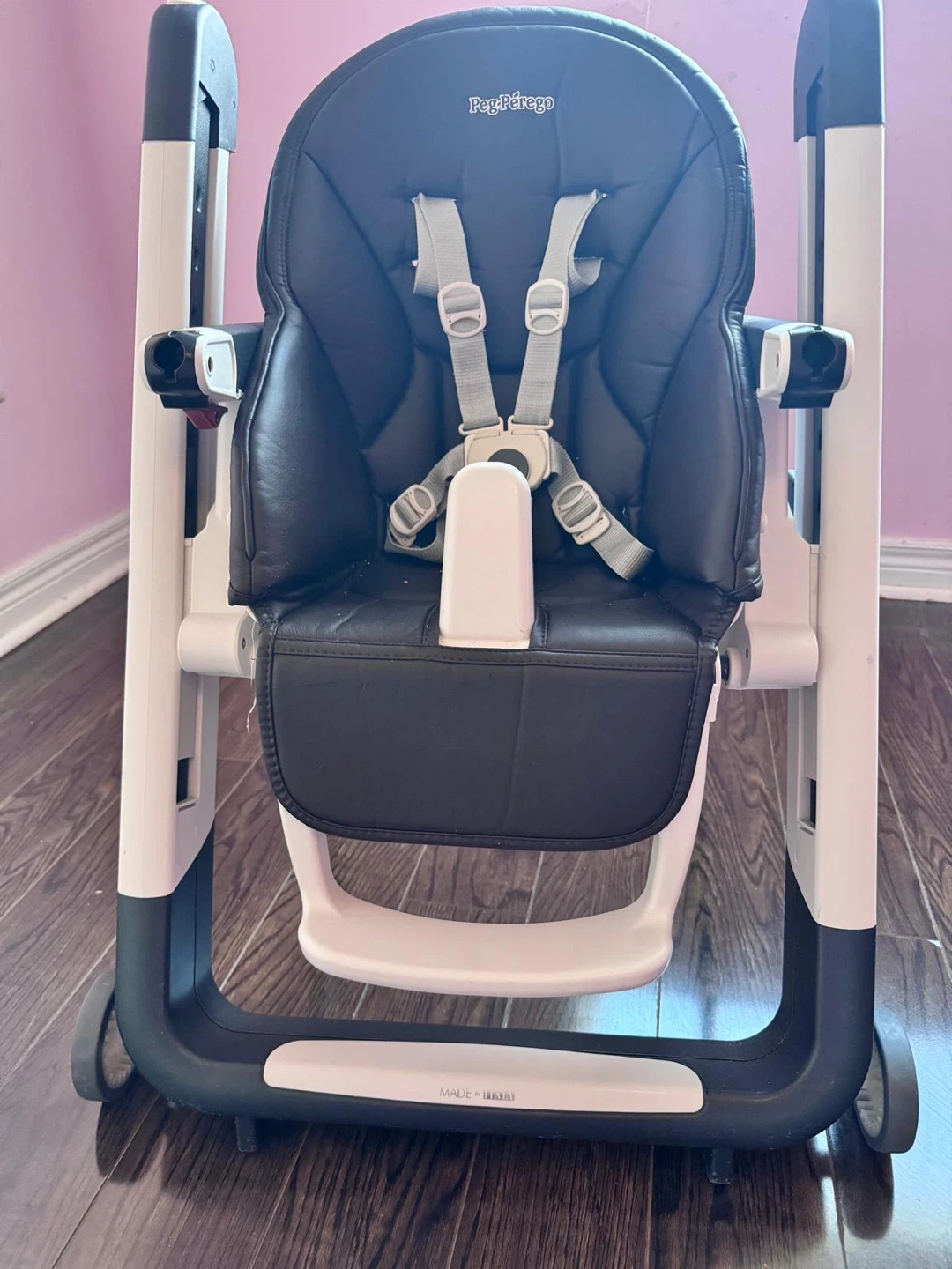 This is a Peg-Pérego high chair with a black seat and a 5-point harness. It's easy to adjust and clean. It's suitable for babies and toddlers during meal times. And I’ve only used this high chair for 5 months and and it’s jus have been sitting there