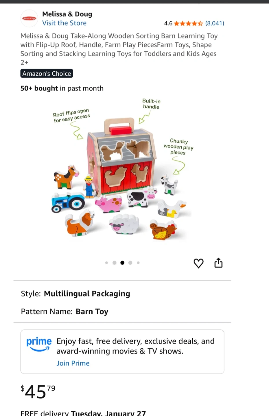 This Melissa & Doug Take-Along Wooden Barn Learning Toy features chunky wooden play pieces. It has a flip-up roof for easy access and a built-in handle for carrying. Kids can sort shapes and stack farm animals!
