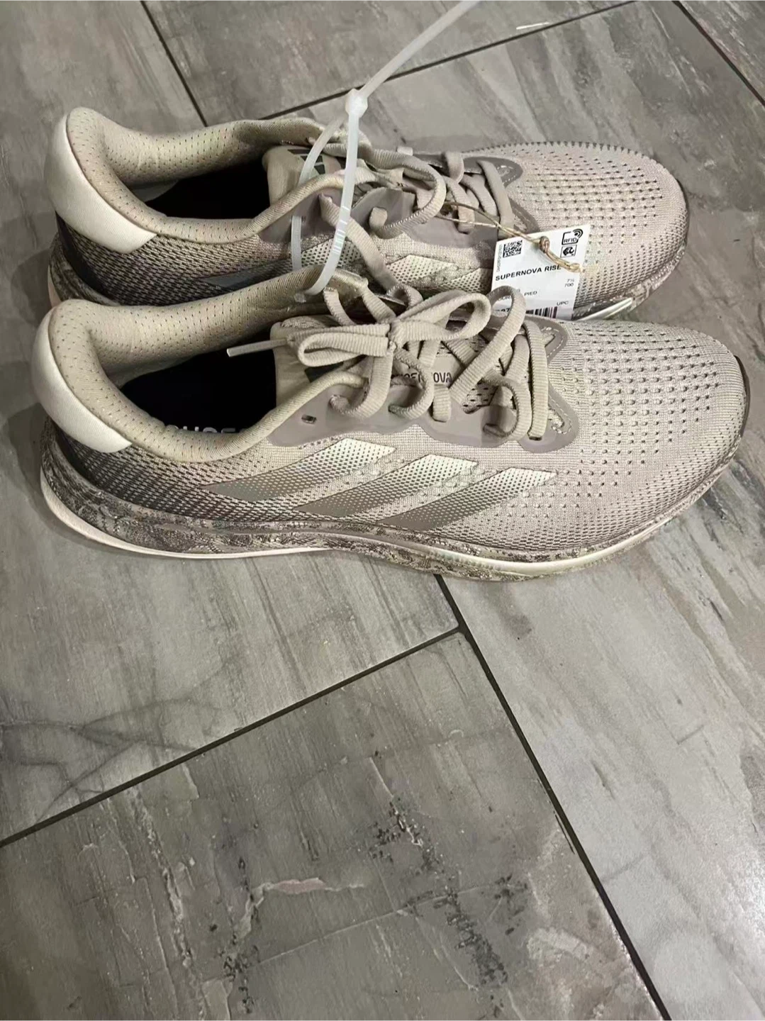 Adidas Supernova Rise running shoes in a light beige colour. They're designed for comfort and performance. Mesh upper with synthetic overlays. Rubber outsole.