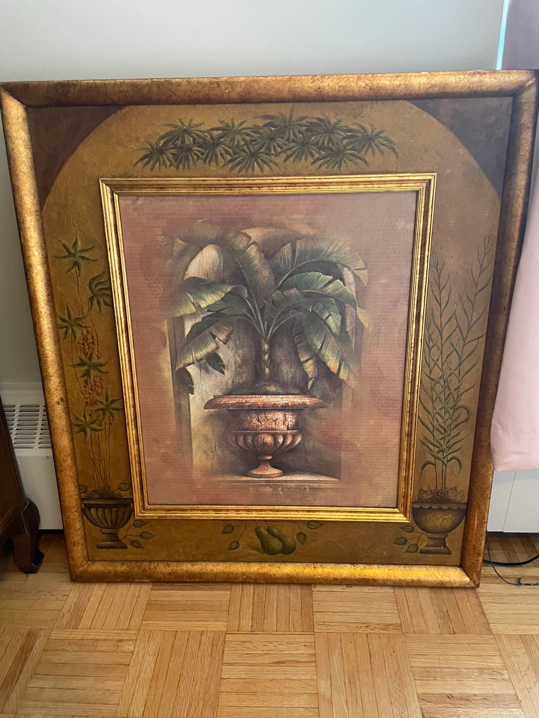 Excellent condition. Painted board framed inside solid wood frame embellished with gold metallic paint. Large size 35”x 35”. Pick up near high park and bloor.