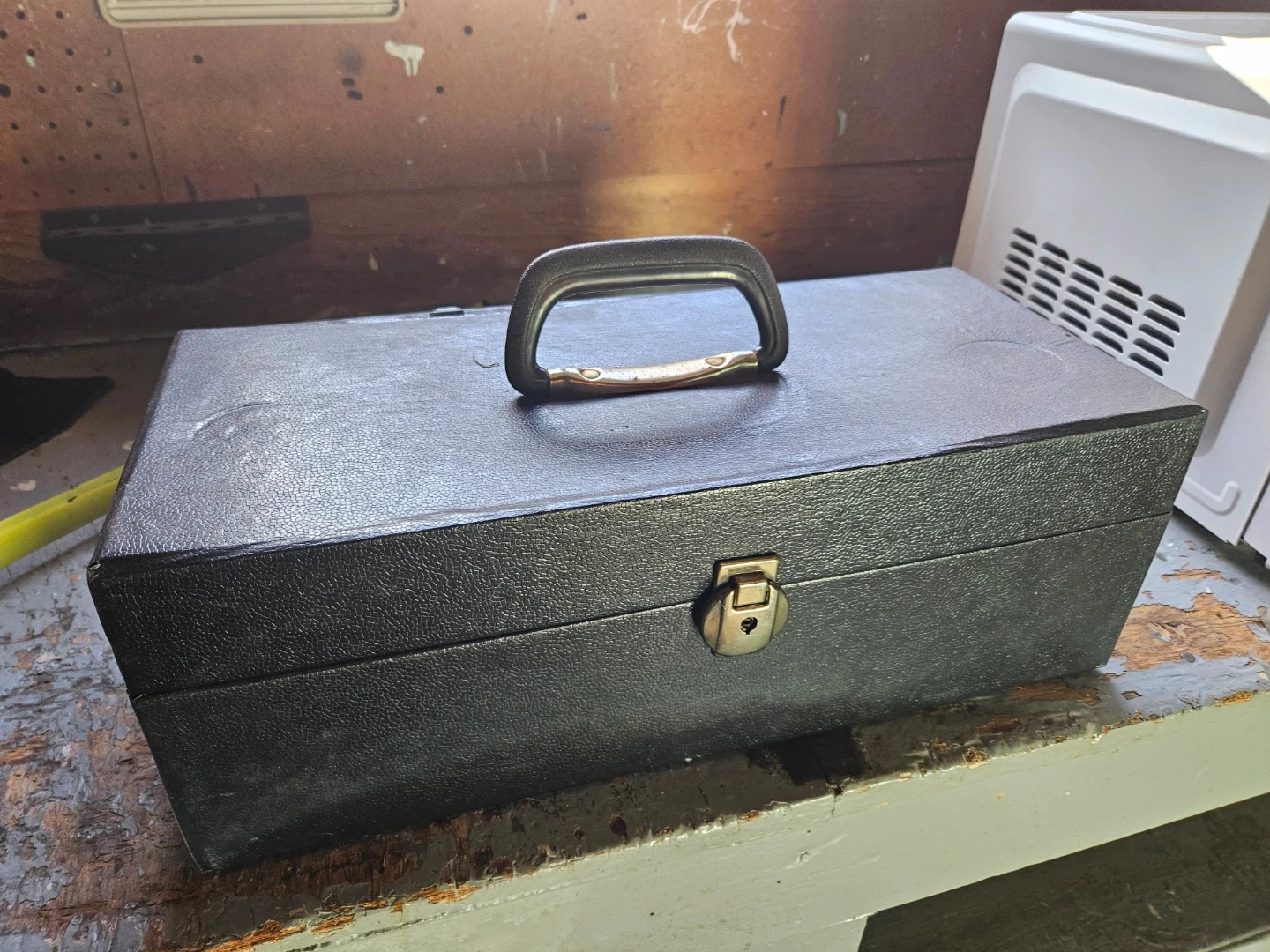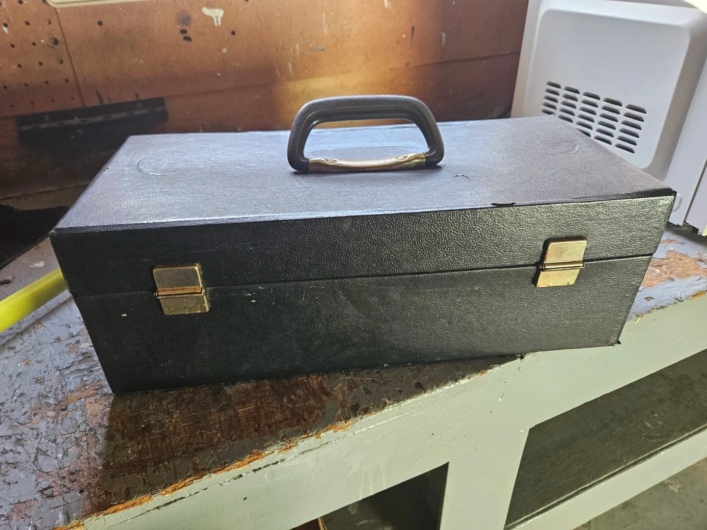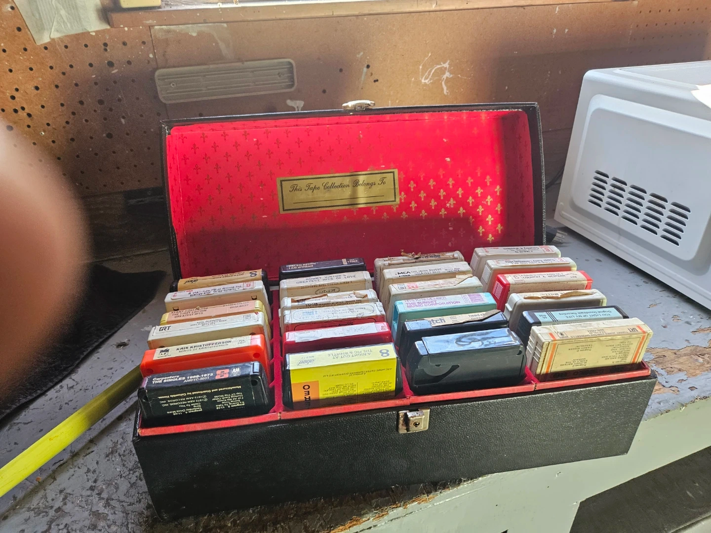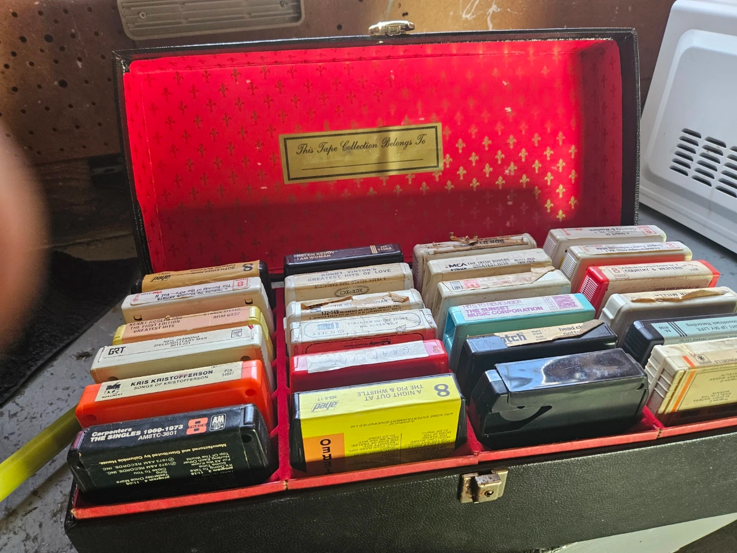 Carrying case for 8-track tapes, with a red satin-lined interior. Includes a collection of assorted 8-track tapes. Perfect for retro music enthusiasts!