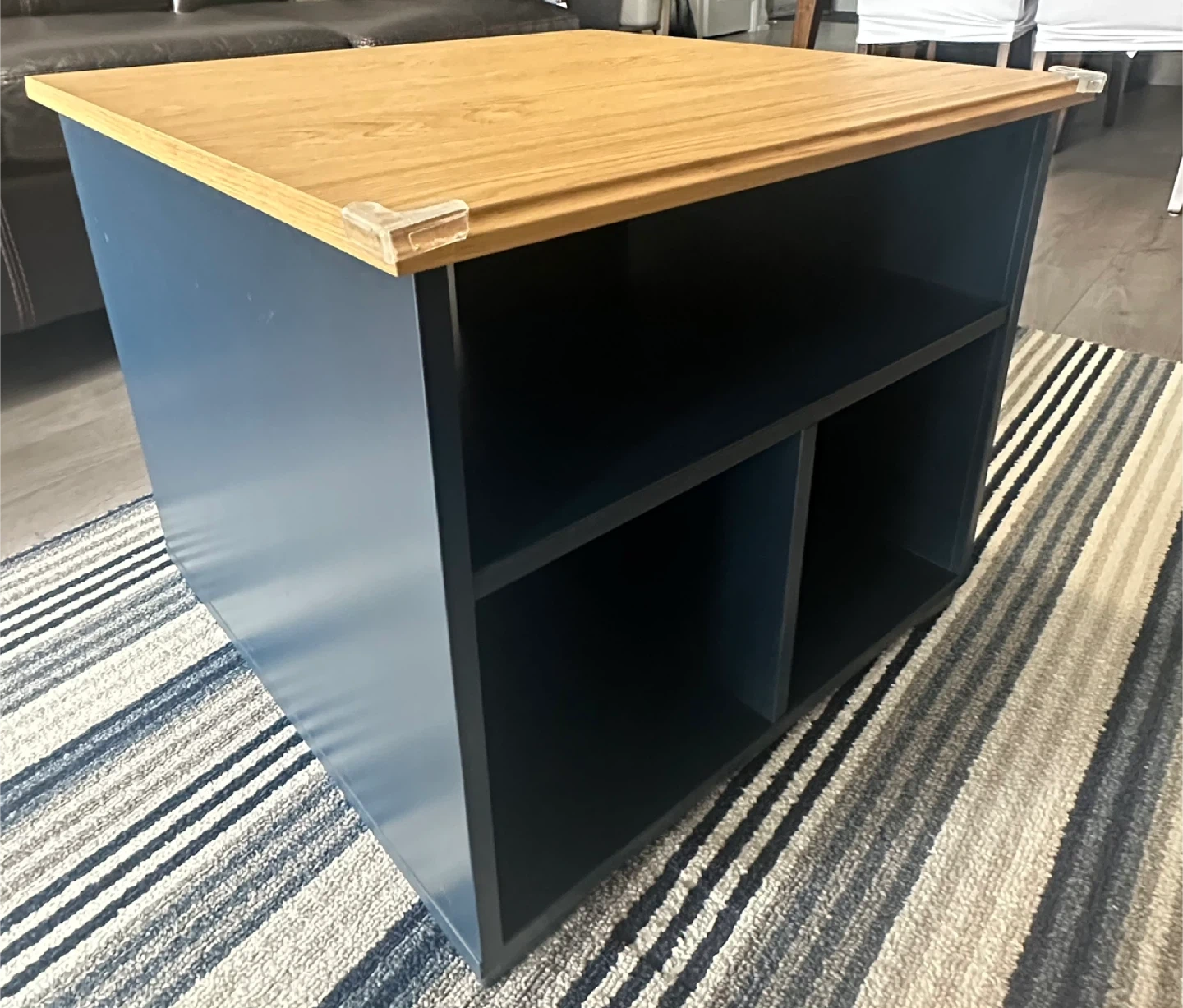 This IKEA SKRUVBY coffee table features a natural oak top with a dark blue base. It offers two open shelves for storage. It's a sturdy and stylish addition to any living room!