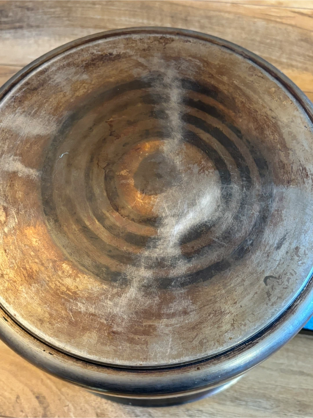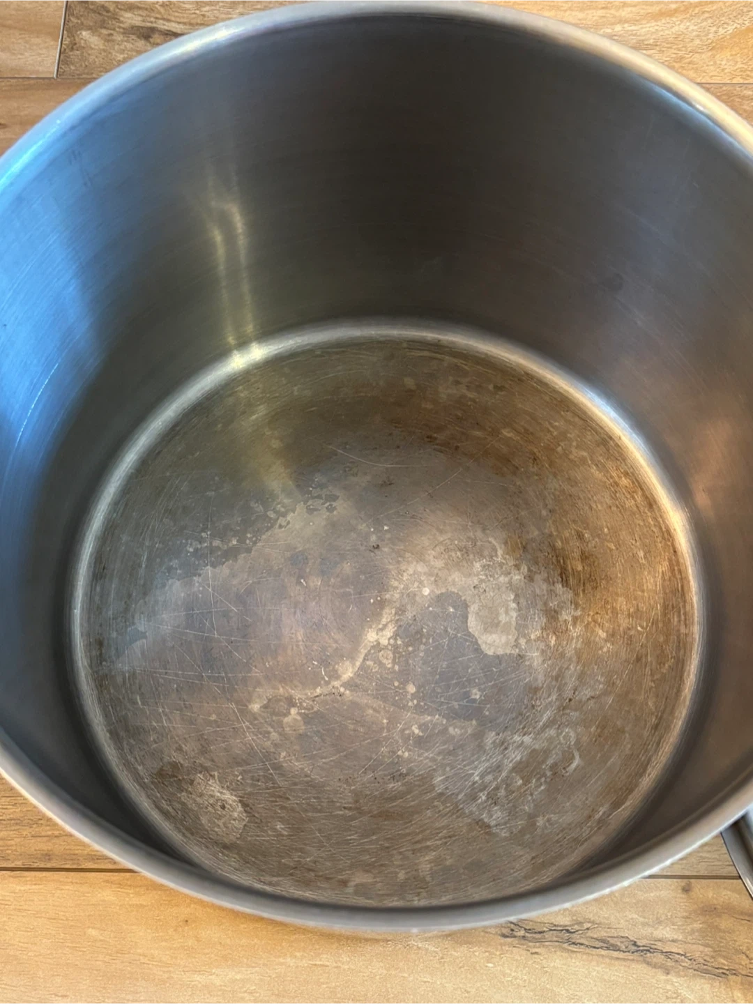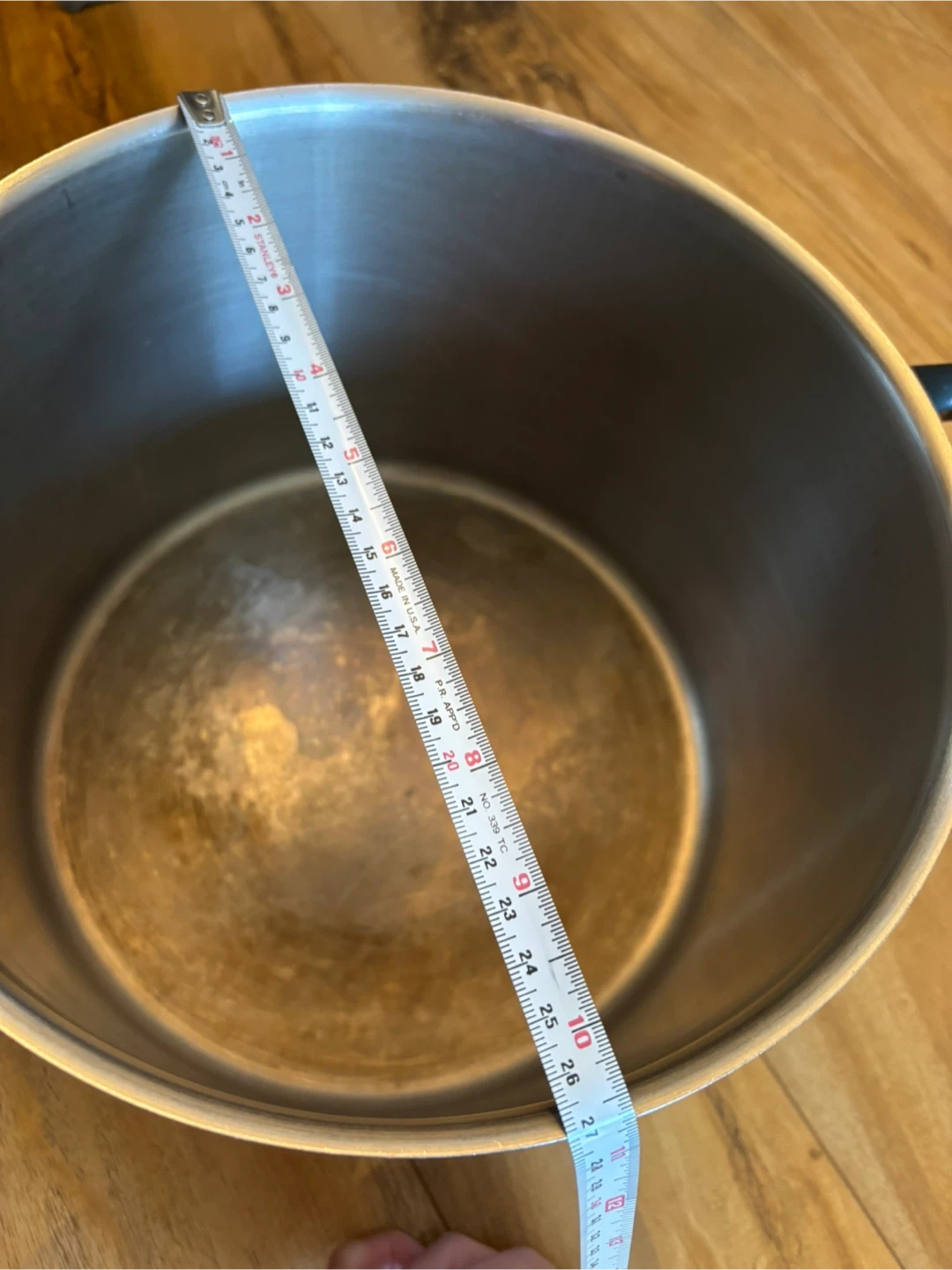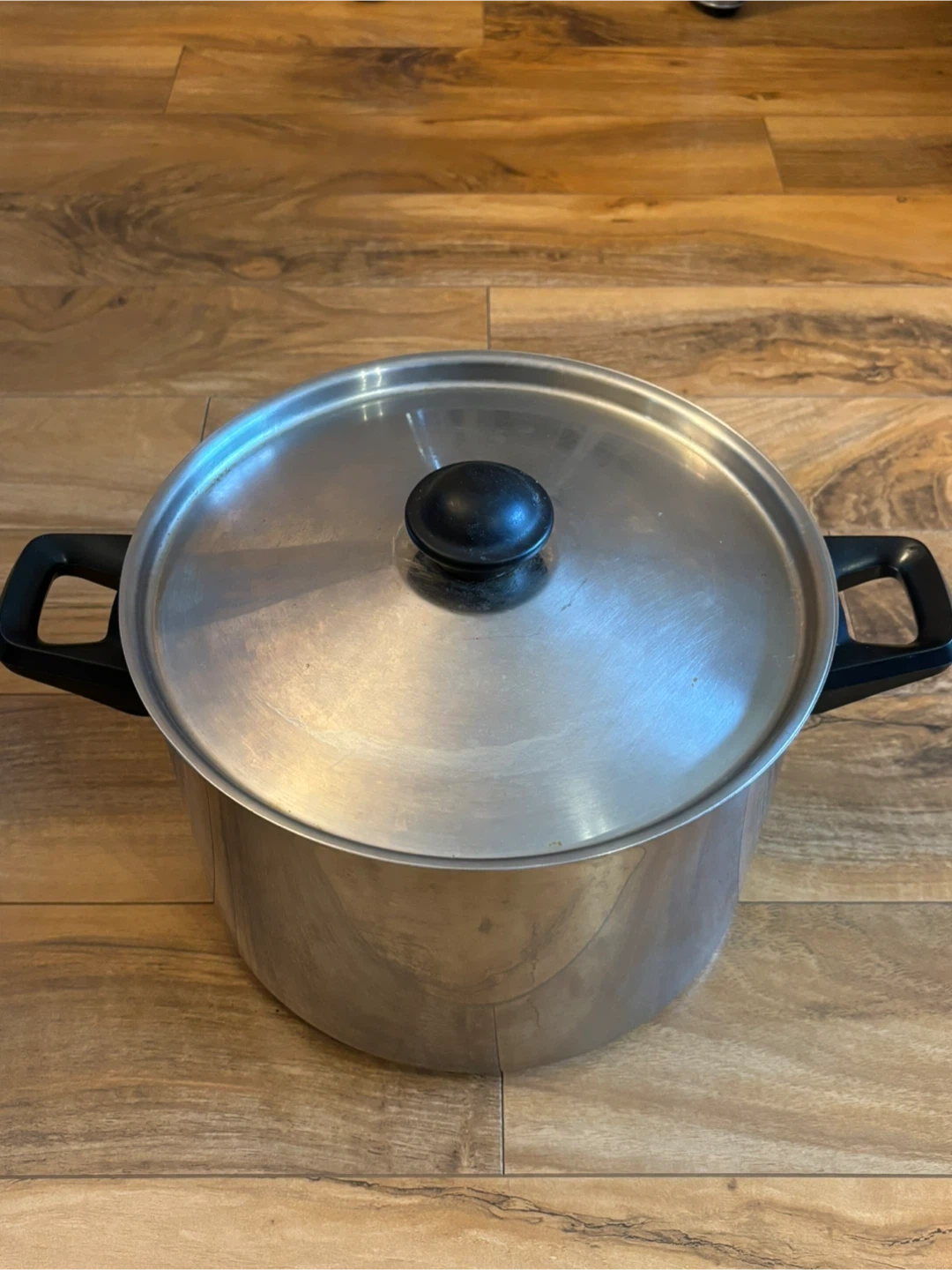 Large stainless steel stock pot with two handles and a matching lid. It's approximately 10QT and 10.5 inches in diameter. Great for making large batches of soup or stew!