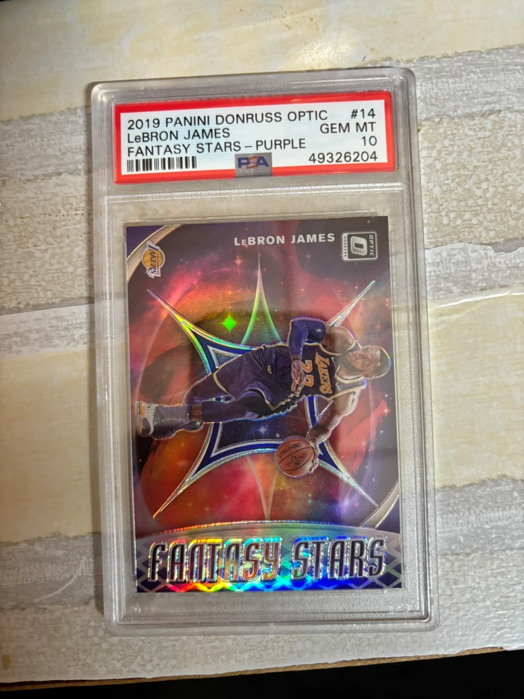 This is a 2019 Panini Donruss Optic card featuring LeBron James. It's part of the Fantasy Stars set and is a purple parallel. The card is graded GEM MT 10 by PSA. It's a highly collectible item for basketball fans.