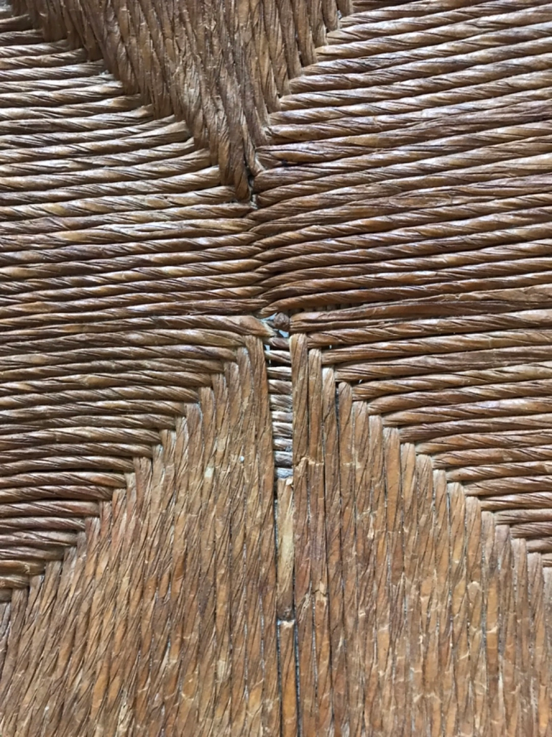 4 rustic style chairs with rush seats.Brown wood frame has been stained with bronze metallic. Small flaws on 2 chairs. Solid seating. Cash only