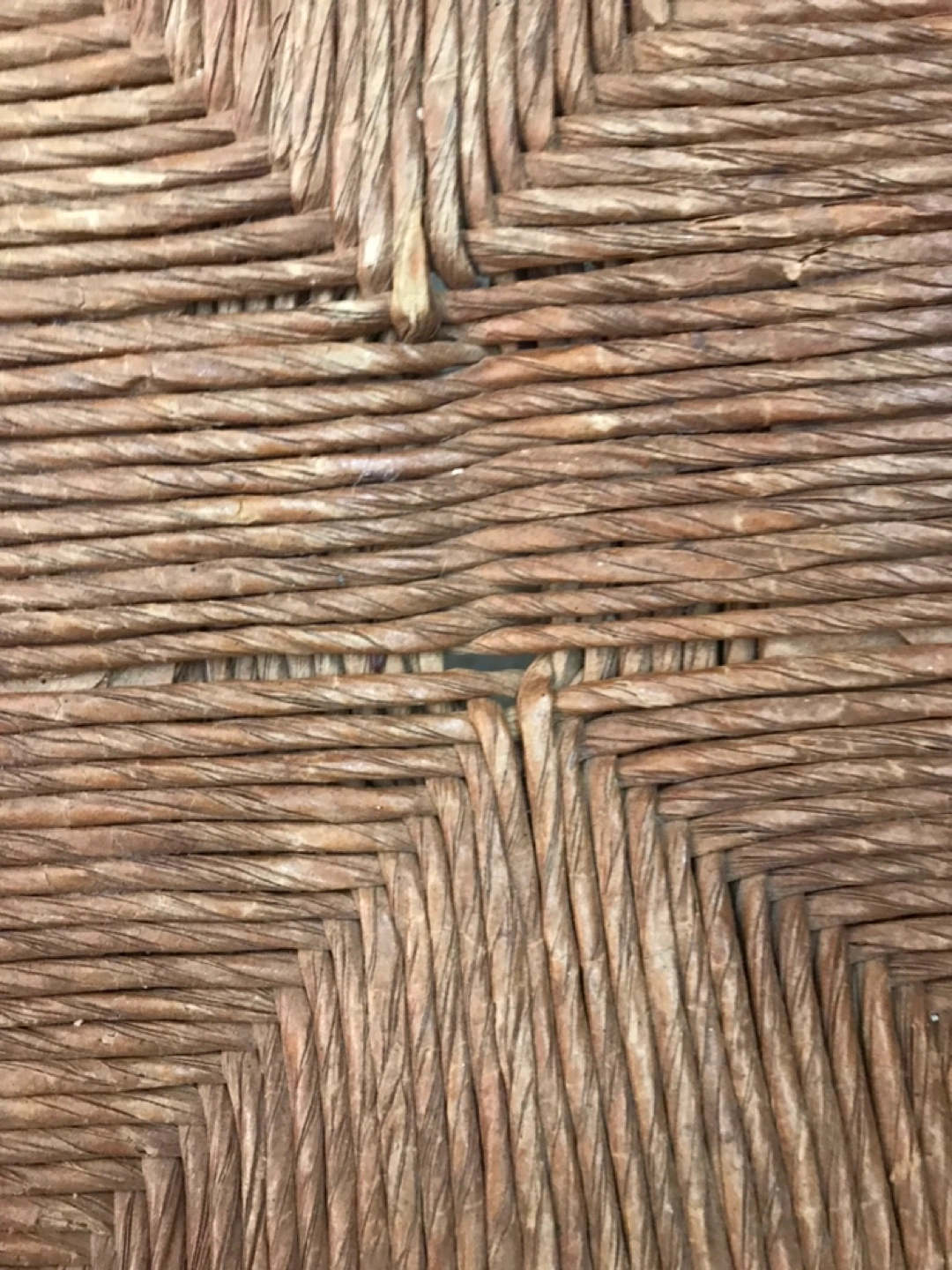 4 rustic style chairs with rush seats.Brown wood frame has been stained with bronze metallic. Small flaws on 2 chairs. Solid seating. Cash only