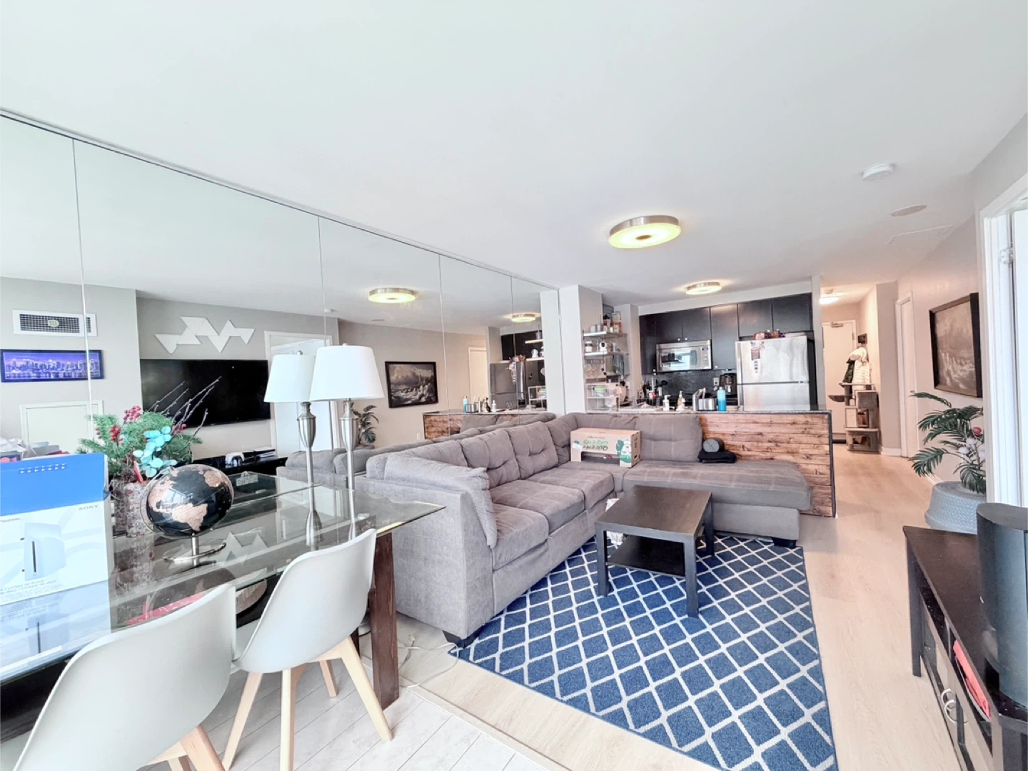 Large grey sectional sofa with a chaise lounge. Upholstered in a durable fabric. Plenty of seating space for your living room!