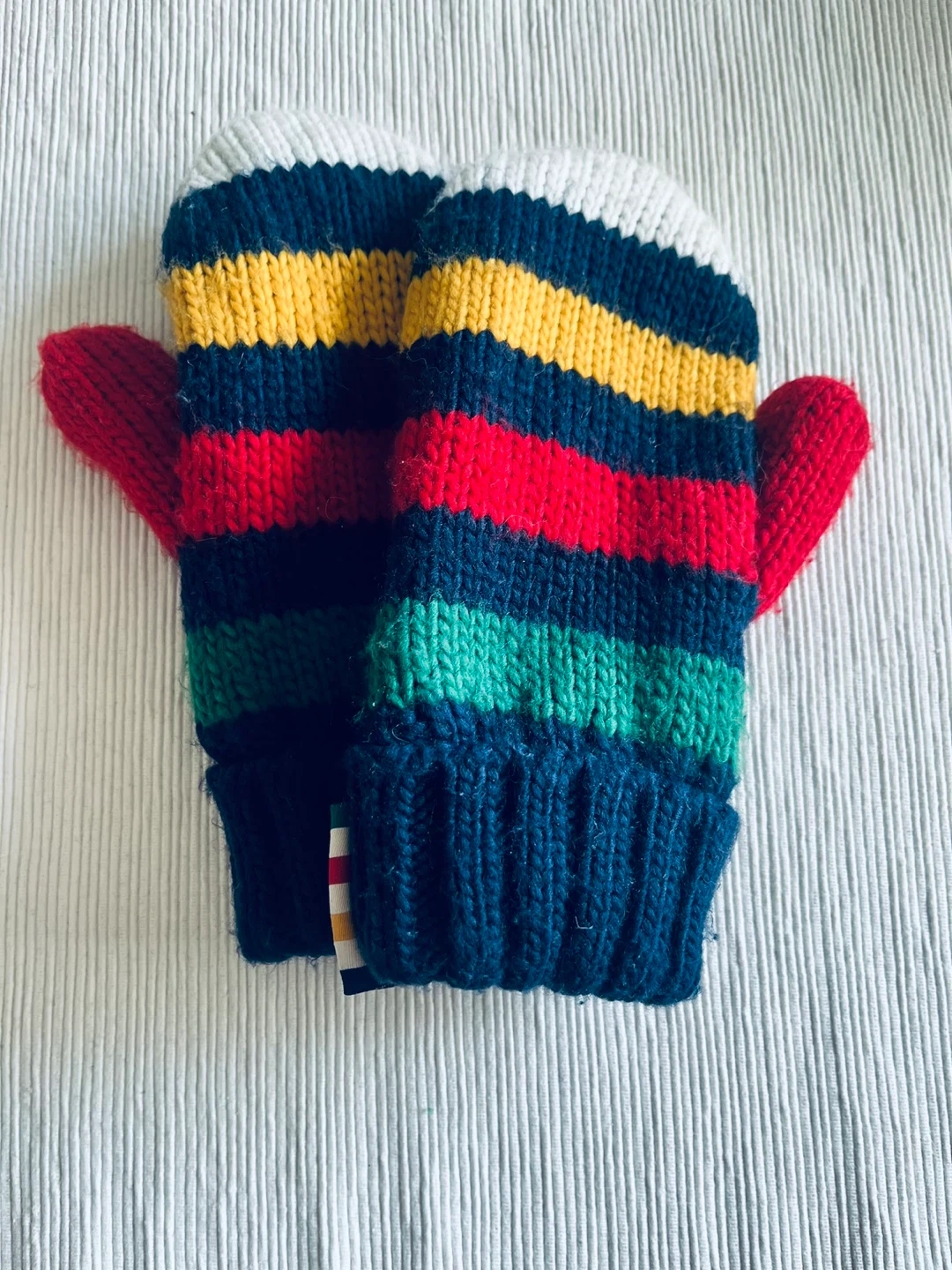520Keep your little one warm with these cozy mittens from the HBC Collection! They feature a colourful striped design with red, yellow, green, and blue. Perfect for those chilly Canadian days!