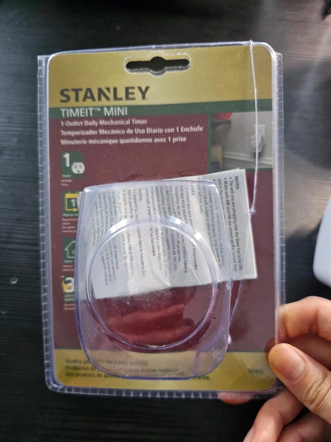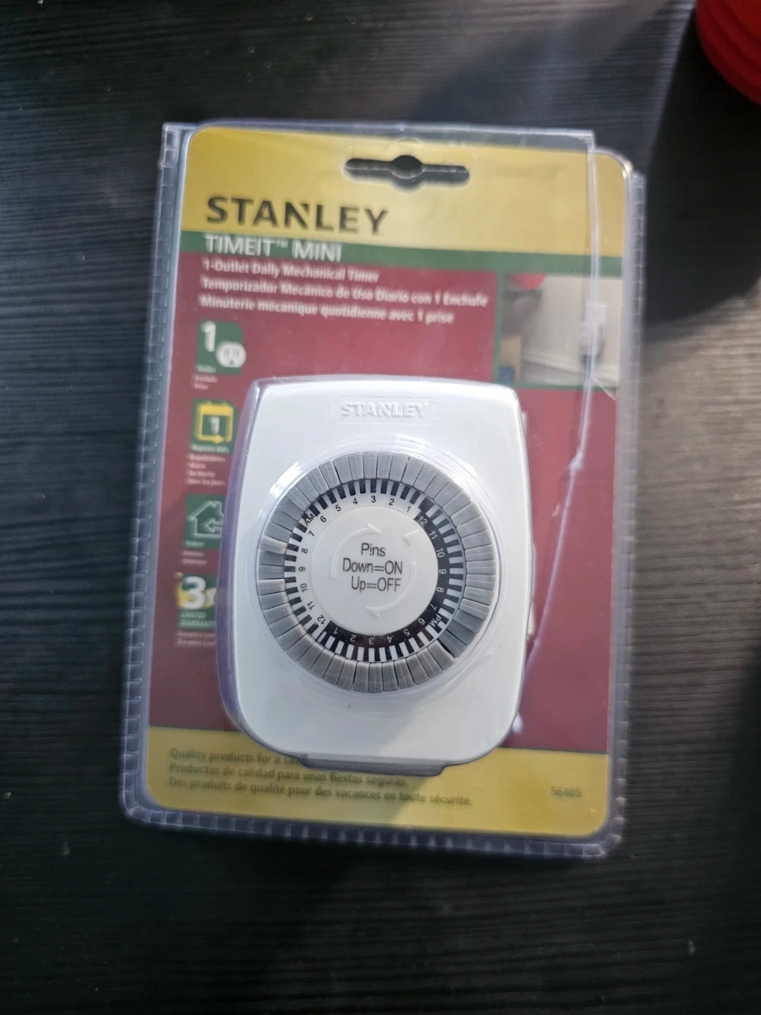 This Stanley TIMEIT Mini mechanical timer features a 1-outlet design.