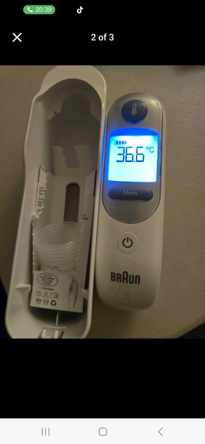 Selling a Braun Thermoscan ear thermometer. It comes with the storage case and some probe covers. It's in good working condition and ready to use!