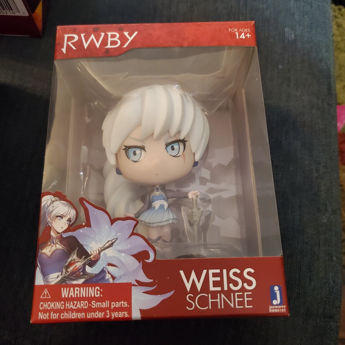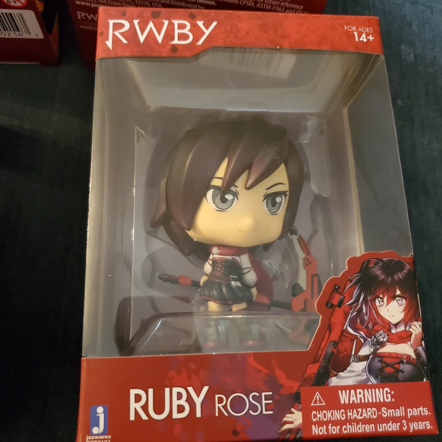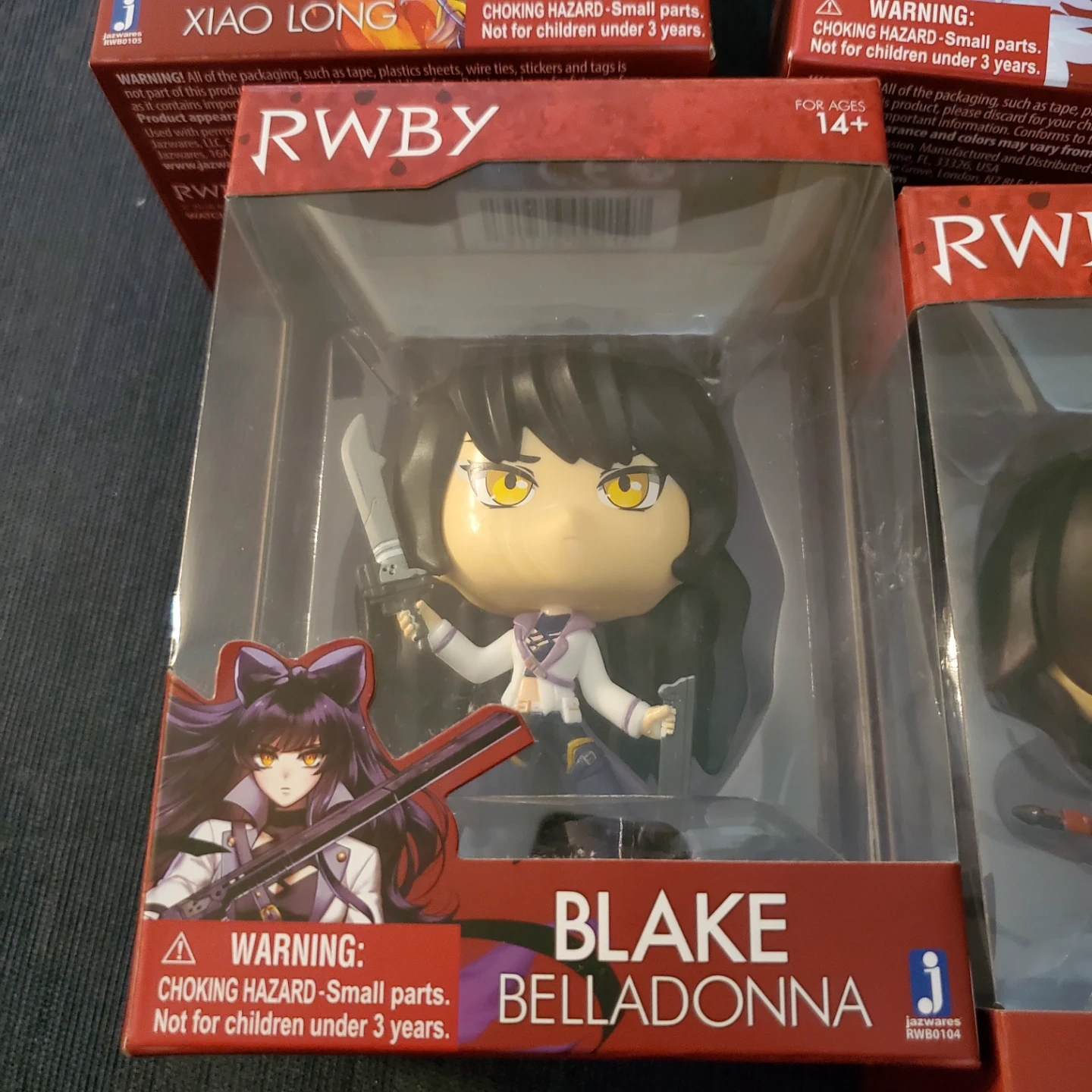 Set of four RWBY Chibi figures featuring Ruby Rose, Weiss Schnee, Blake Belladonna, and Yang Xiao Long. These collectible figures are for ages 14+. Each figure comes in its original box packaging.