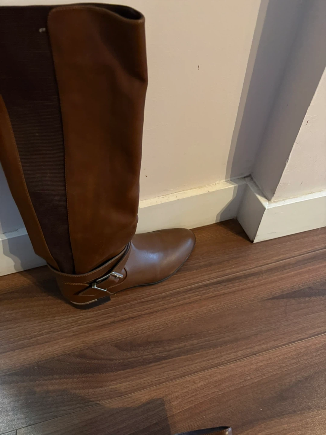 These are a pair of brown knee-high boots! They are in good condition and would be a great addition to your wardrobe