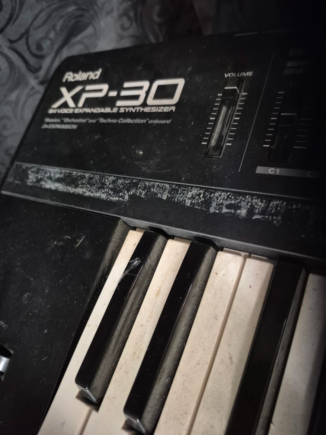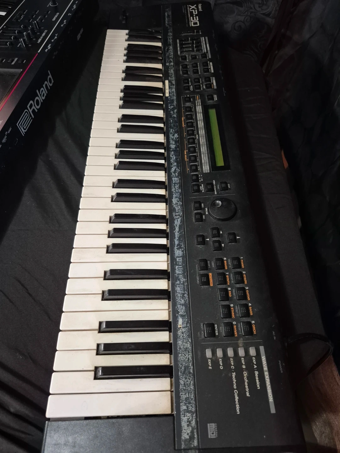 Roland XP-30 64-voice expandable synthesizer. Includes "Orchestral/Techno Collection" onboard. 2x Expansion slots available. This unit has some wear and tear on the casing.