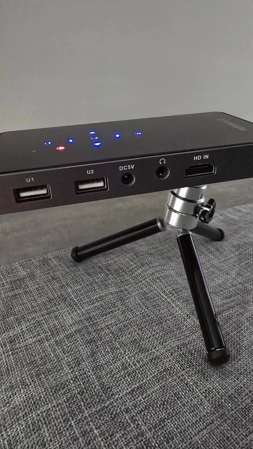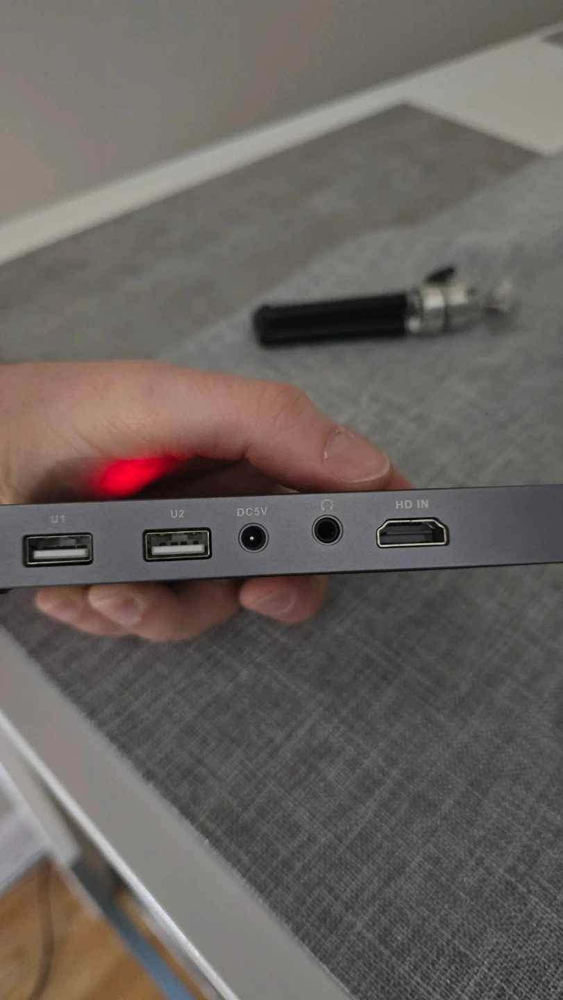 This is a Smart Mini Projector. It supports HD resolution and features two USB ports, a DC 5V input, and an HDMI input. It's compact and portable for on-the-go entertainment!