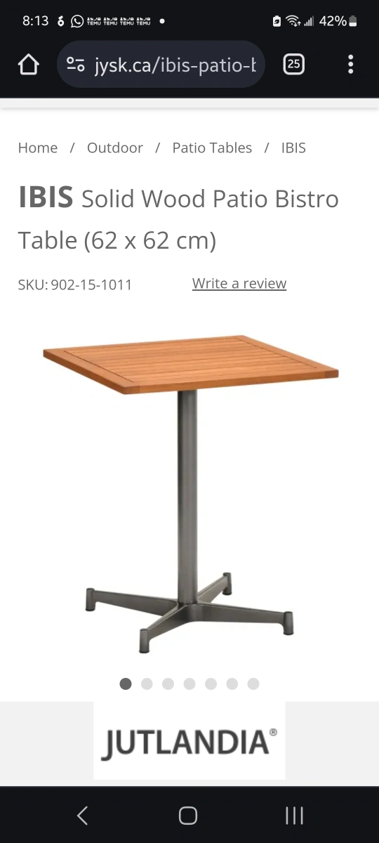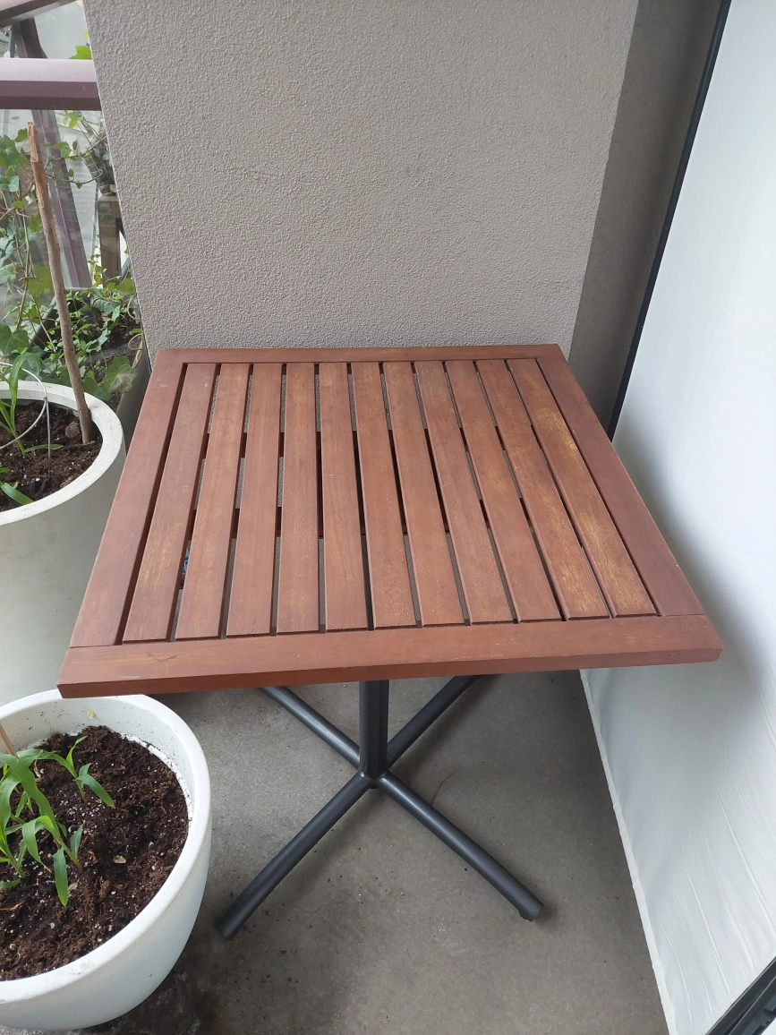 Wood and metal patio table with adjustable feet; called Ibis from Jysk. Dimensions 2'×2' or 62cm by 62cm. Originally $159 plus tax only asking $75. cross posted.