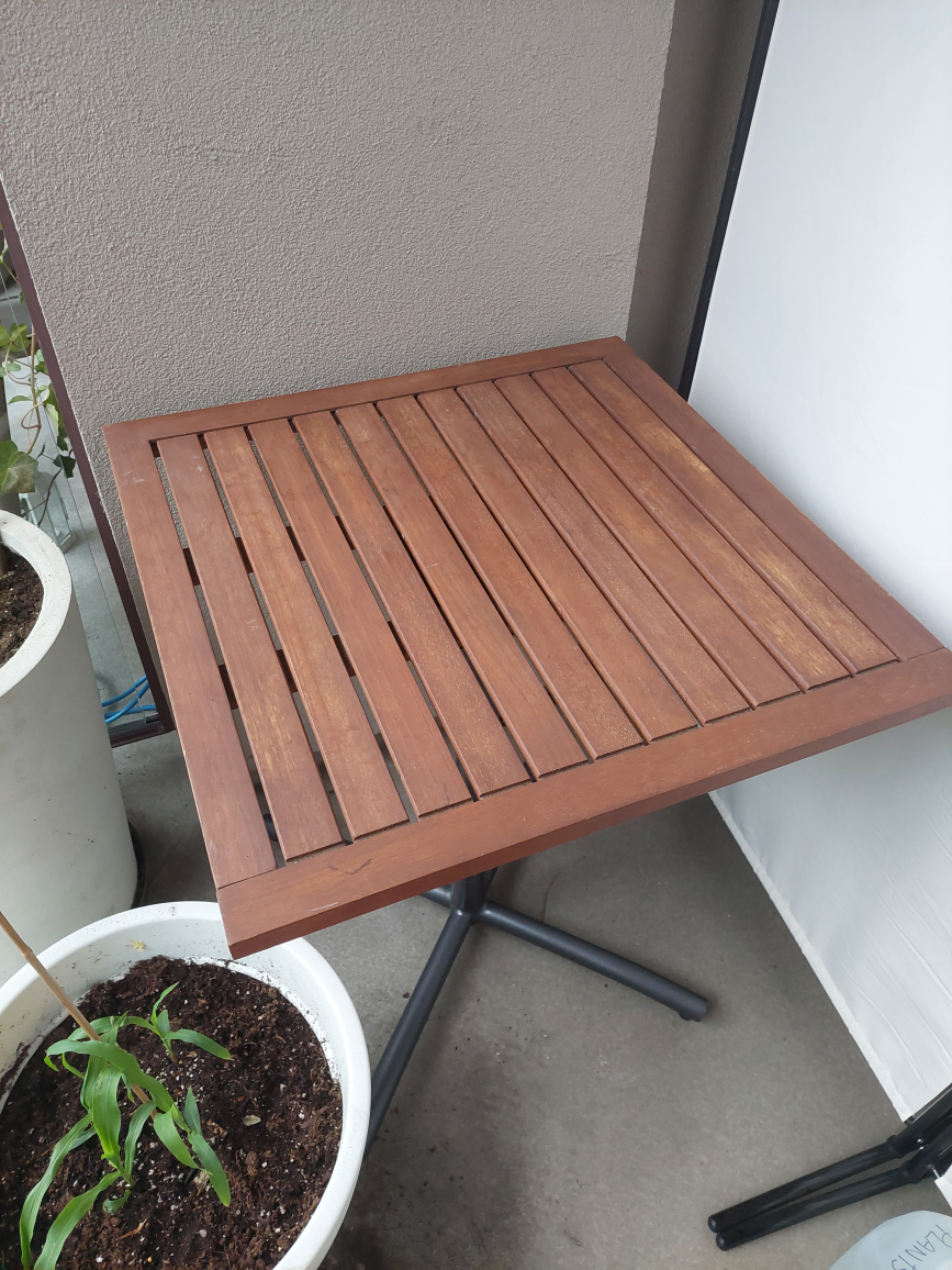 Wood and metal patio table with adjustable feet; called Ibis from Jysk. Dimensions 2'×2' or 62cm by 62cm. Originally $159 plus tax only asking $75. cross posted.
