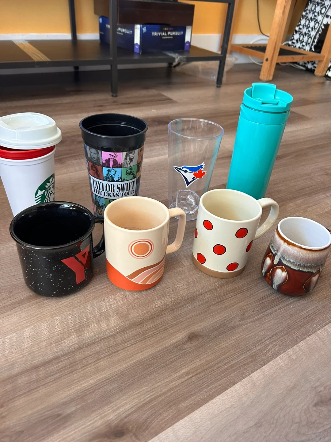 Fun collection of mugs and cups. Includes 2 Starbucks reusable cups, black Taylor Swift Eras Tour cup, Toronto Blue Jays logo cup, David’s Tea Press, mix of mugs