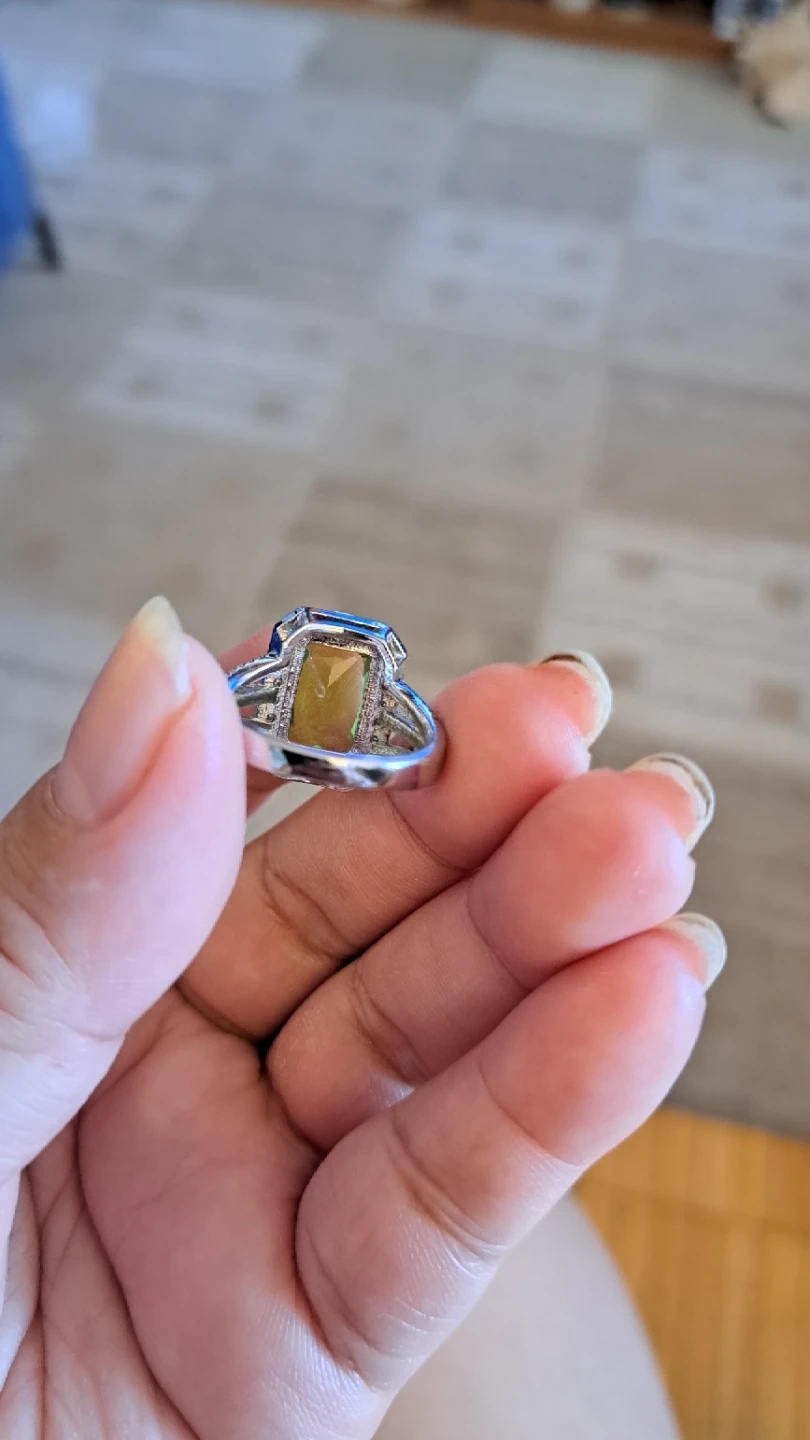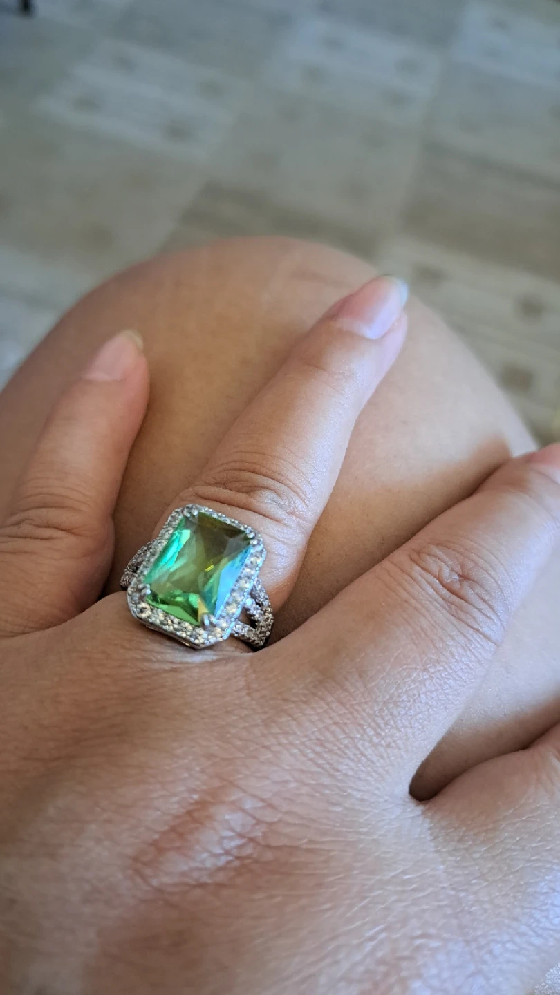 Beautiful ring featuring a large, emerald-cut green gemstone surrounded by small clear stones. The band is silver-toned with a textured design. It's a real eye-catcher!