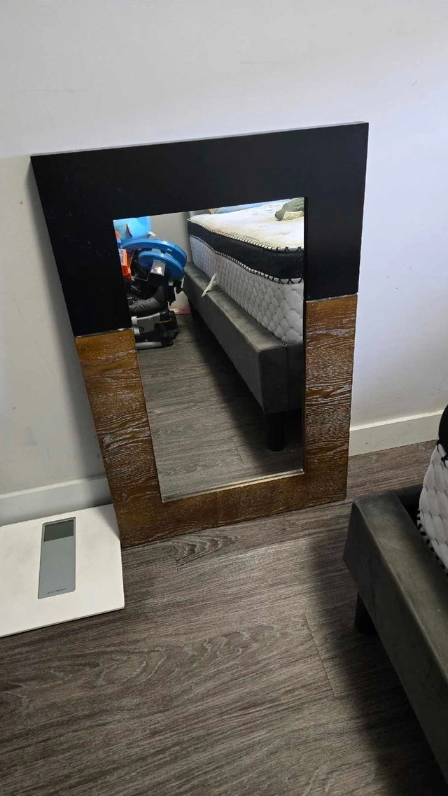 Add a touch of modern elegance to your space with this stylish mirror, featuring a unique black and gold-tone frame. This mirror is in used condition, ready to bring a distinctive flair to any room. It measures 24x36 inches, a great size for an entryway, bedroom, or living area. If the ad is still up, the mirror is still available! Cash accepted.