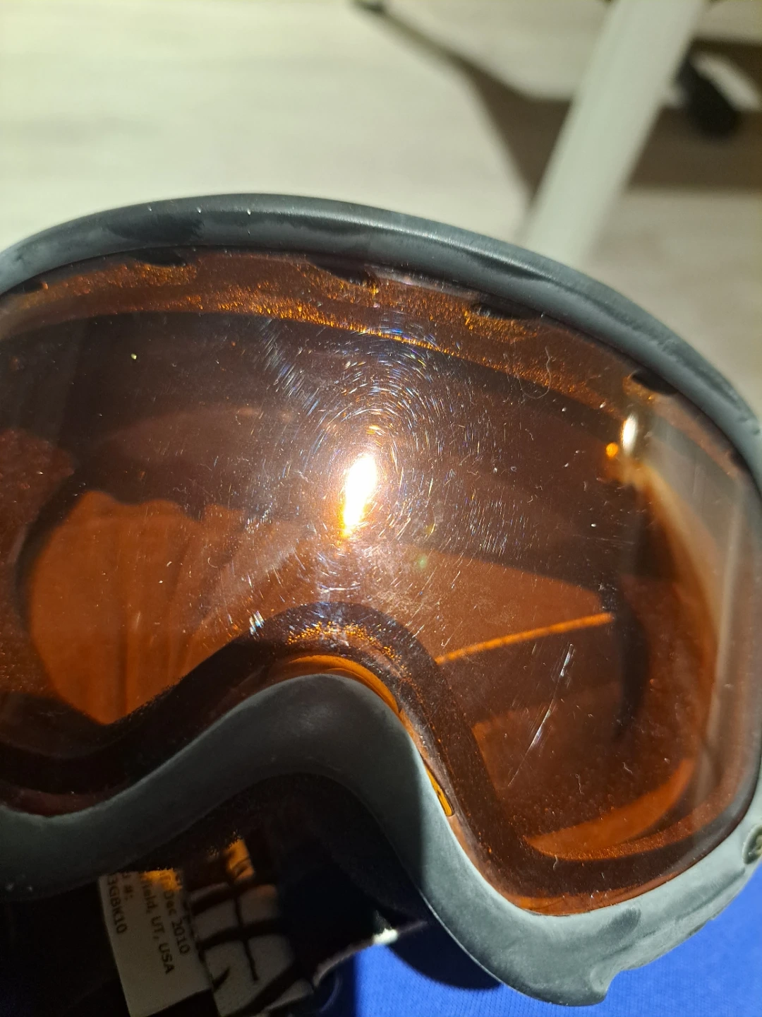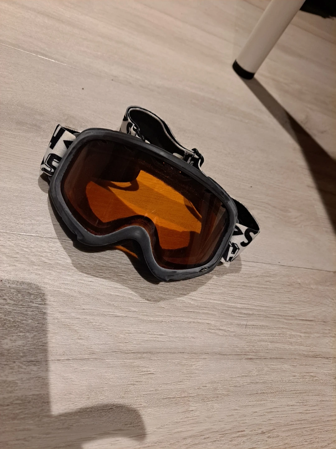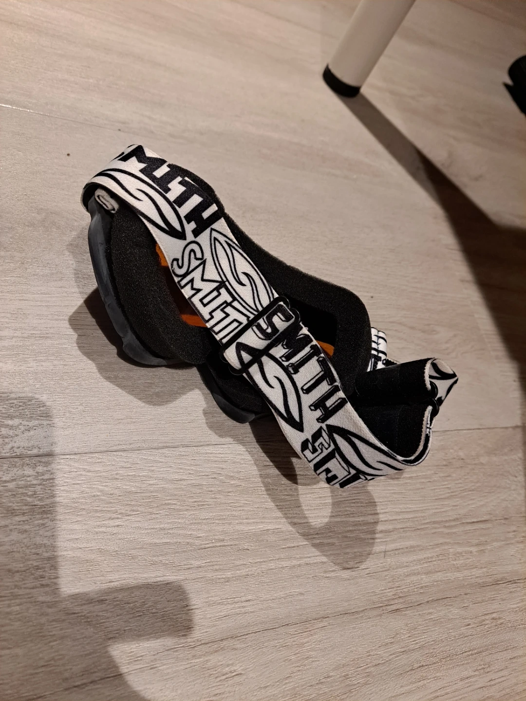 Ski goggles from Smith Optics. Features an orange lens and adjustable strap. Shows some signs of wear on the lens.