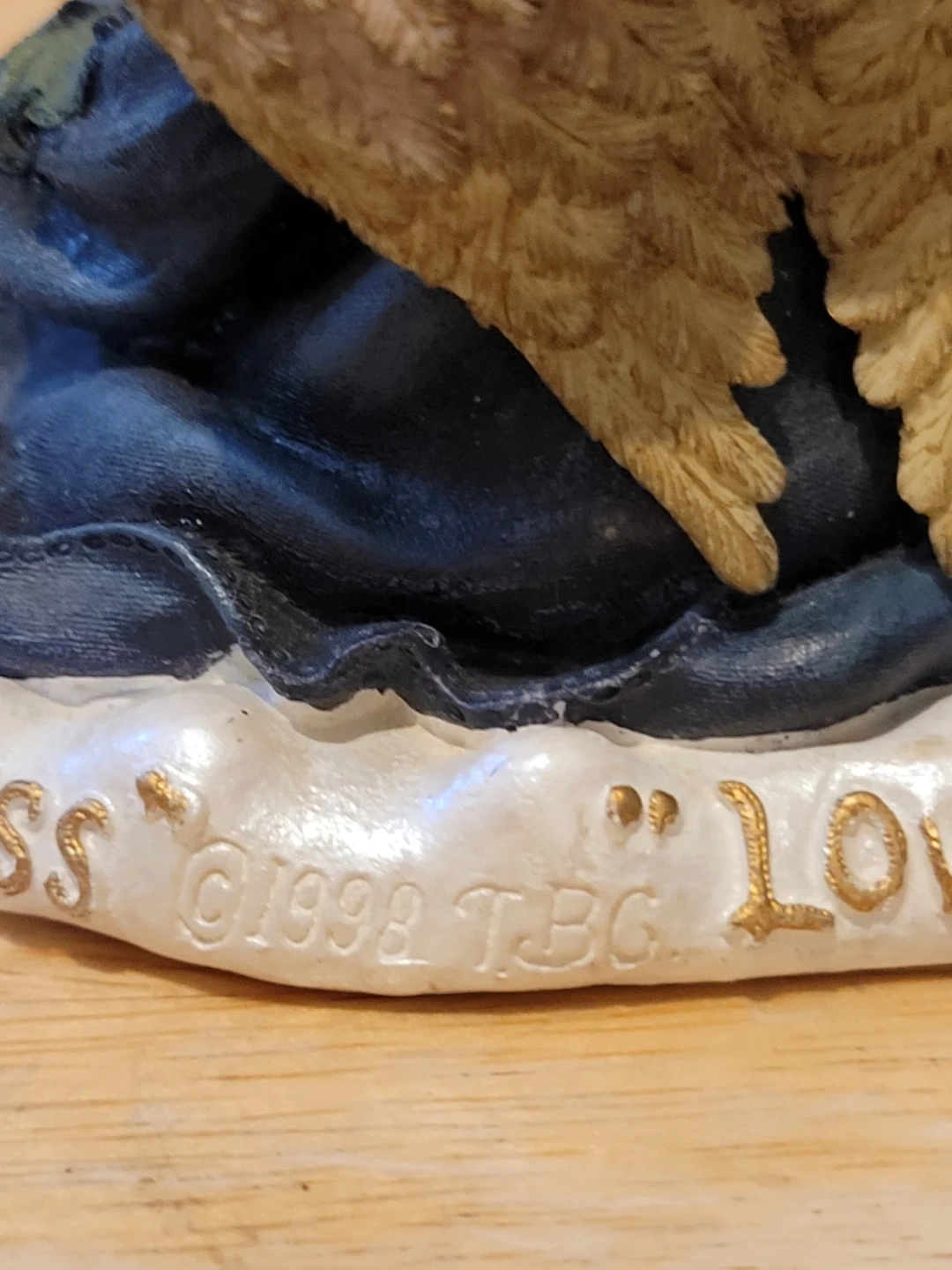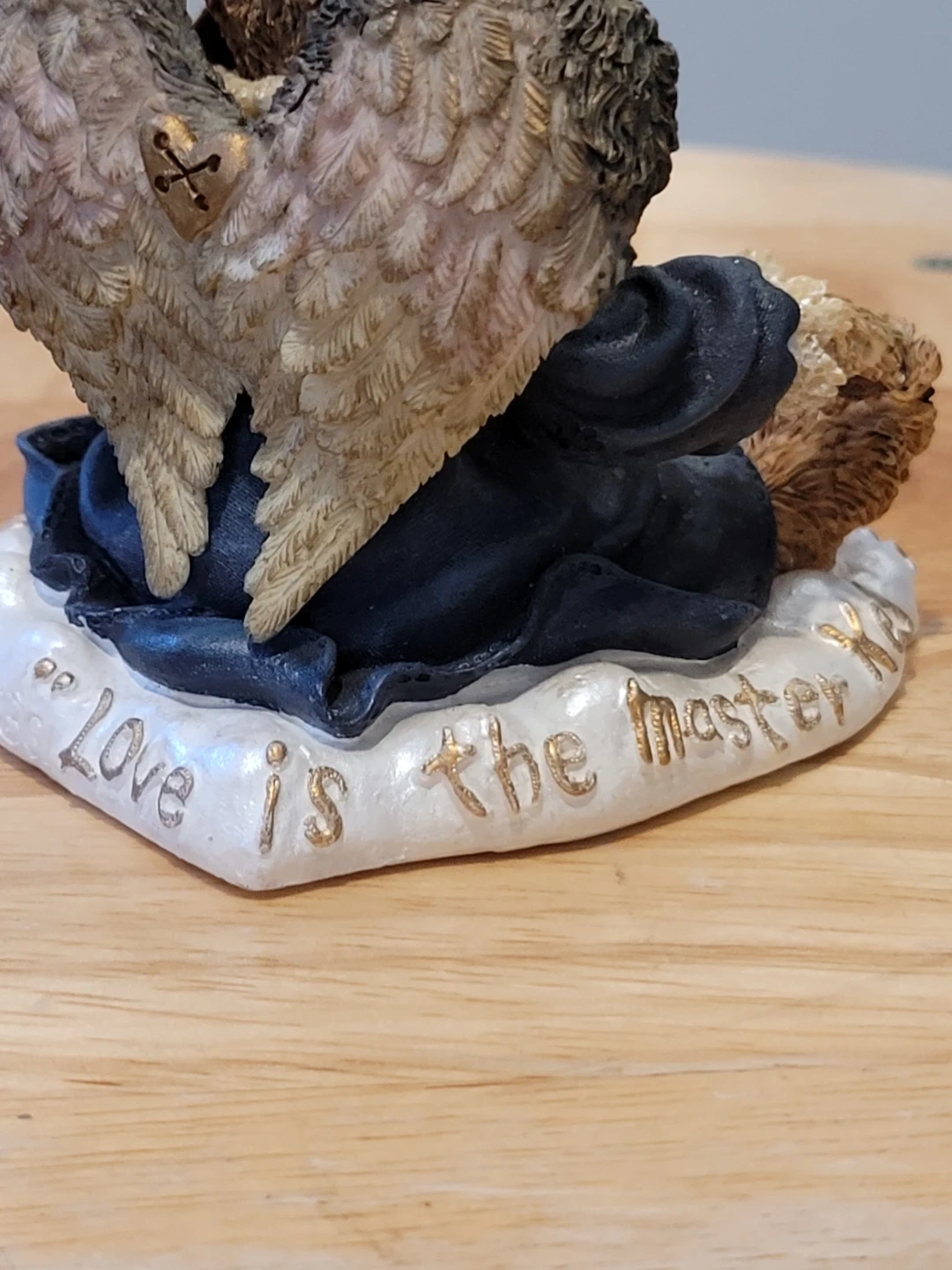 This is a Boyds Bears & Friends Bearstone Collection figurine. It's from the Bearstone Collection and is style number 228317 Gwain. The figurine is about 3 inches tall and features a teddy bear with angel wings sitting on a heart-shaped base that reads, "Love is the master key that opens the gates of happiness."