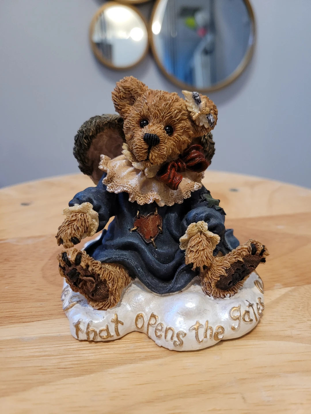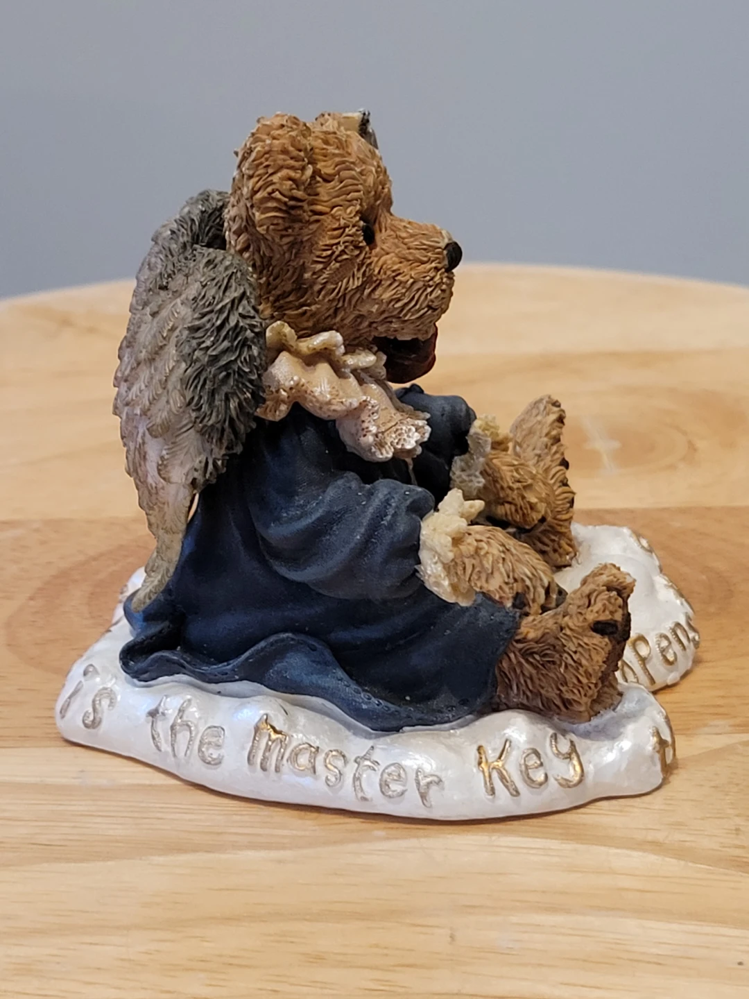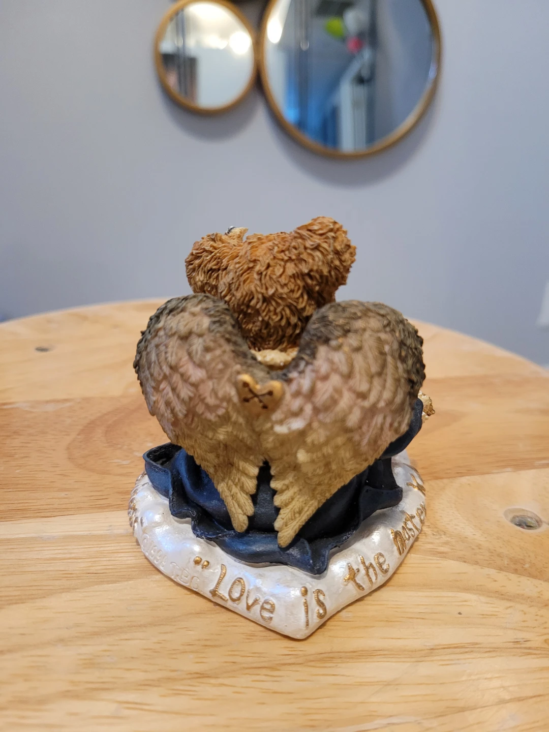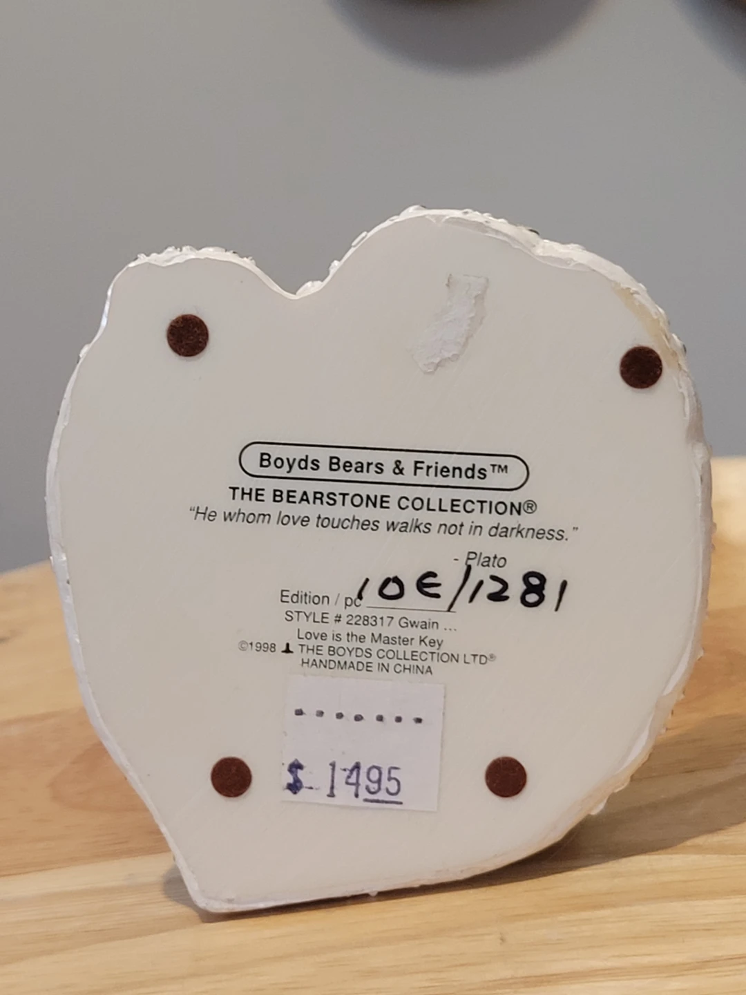 This is a Boyds Bears & Friends Bearstone Collection figurine. It's from the Bearstone Collection and is style number 228317 Gwain. The figurine is about 3 inches tall and features a teddy bear with angel wings sitting on a heart-shaped base that reads, "Love is the master key that opens the gates of happiness."