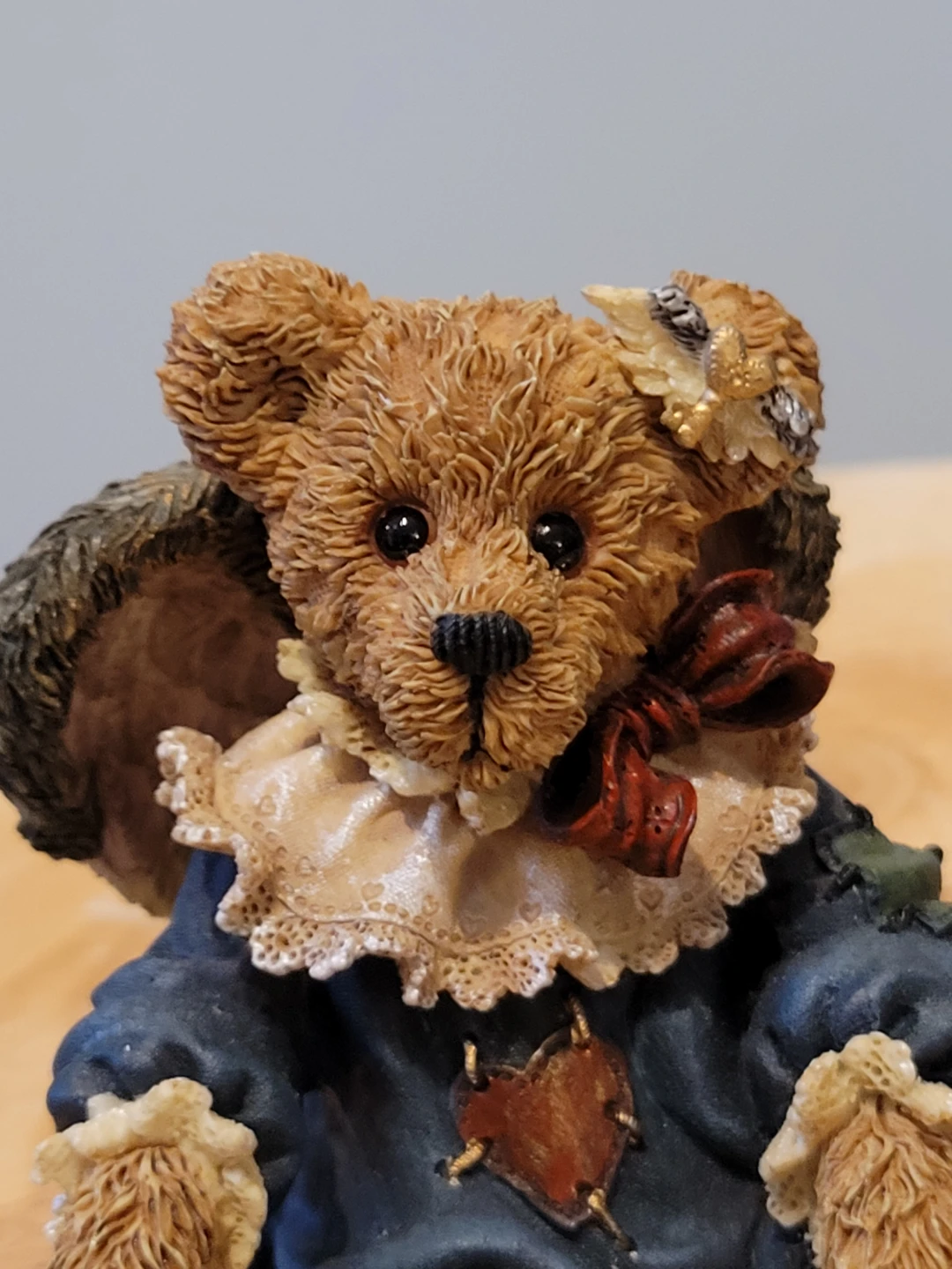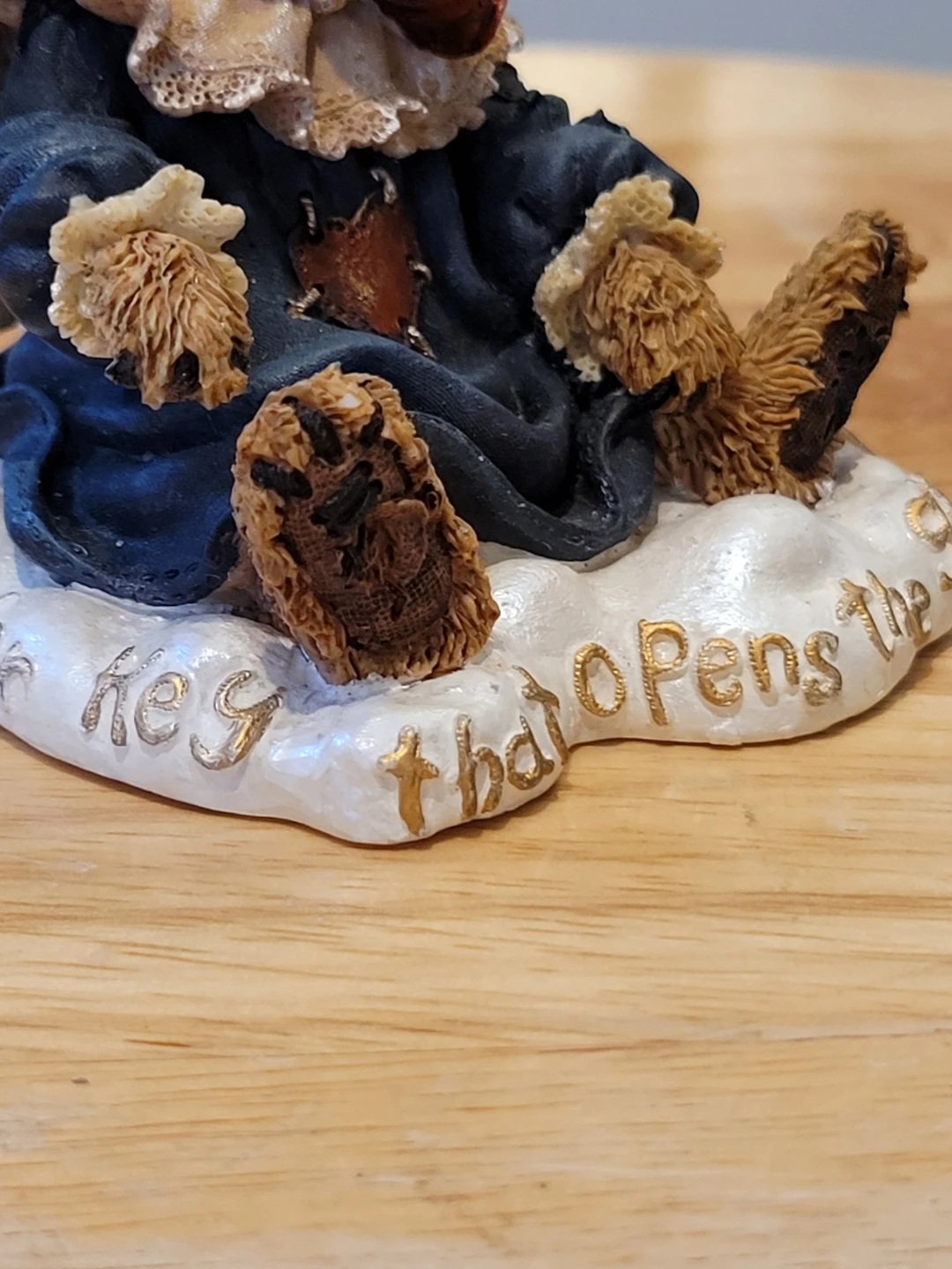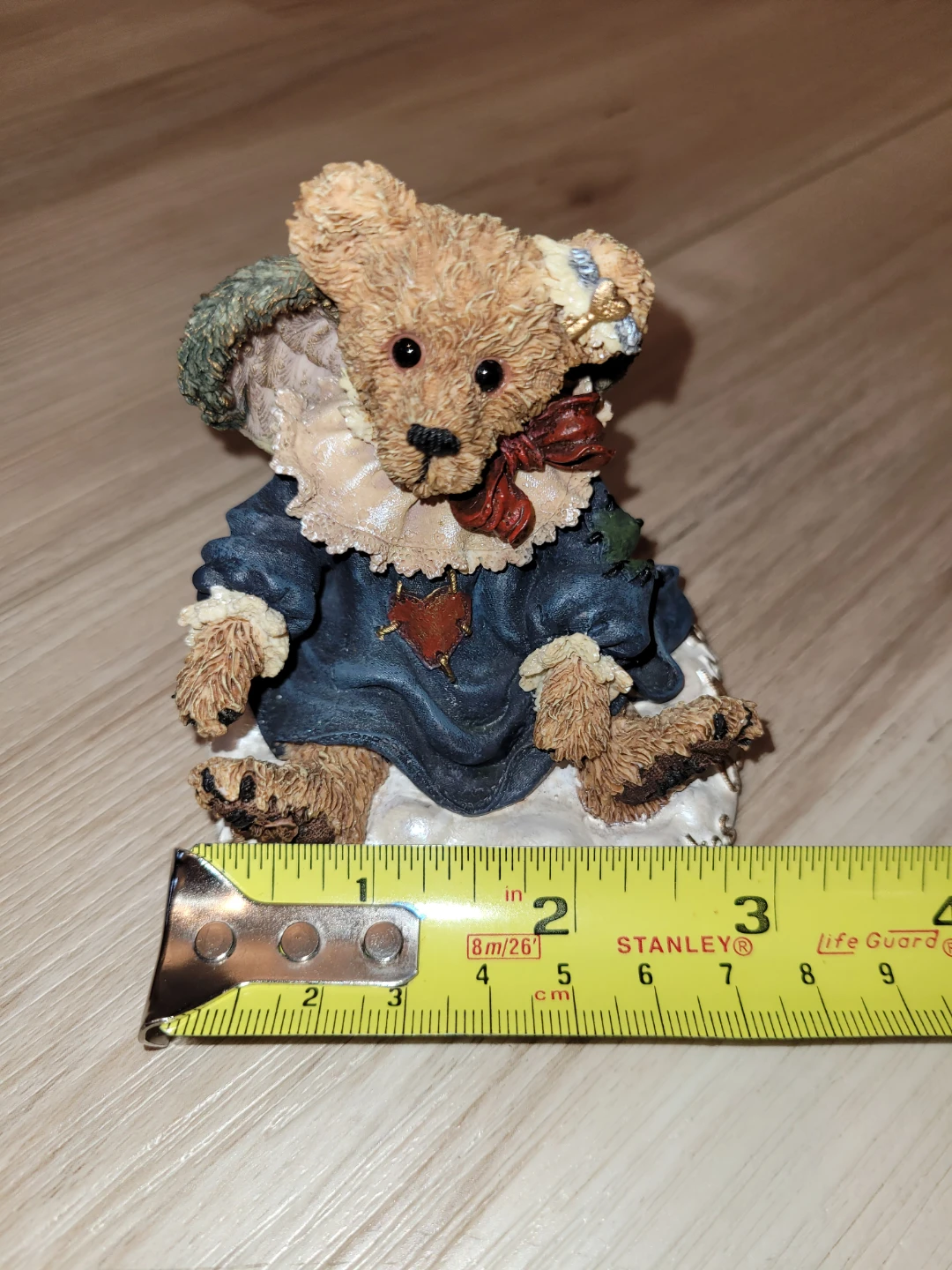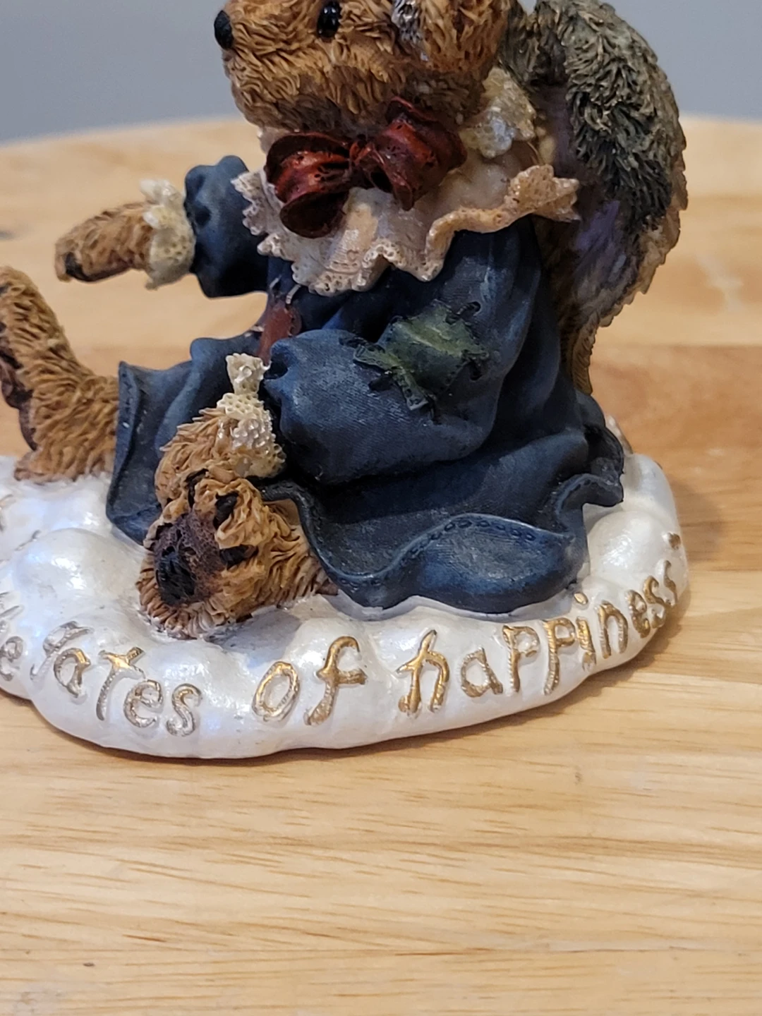 This is a Boyds Bears & Friends Bearstone Collection figurine. It's from the Bearstone Collection and is style number 228317 Gwain. The figurine is about 3 inches tall and features a teddy bear with angel wings sitting on a heart-shaped base that reads, "Love is the master key that opens the gates of happiness."