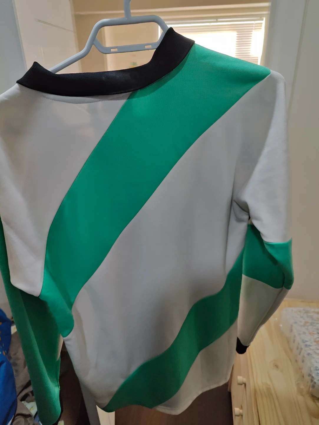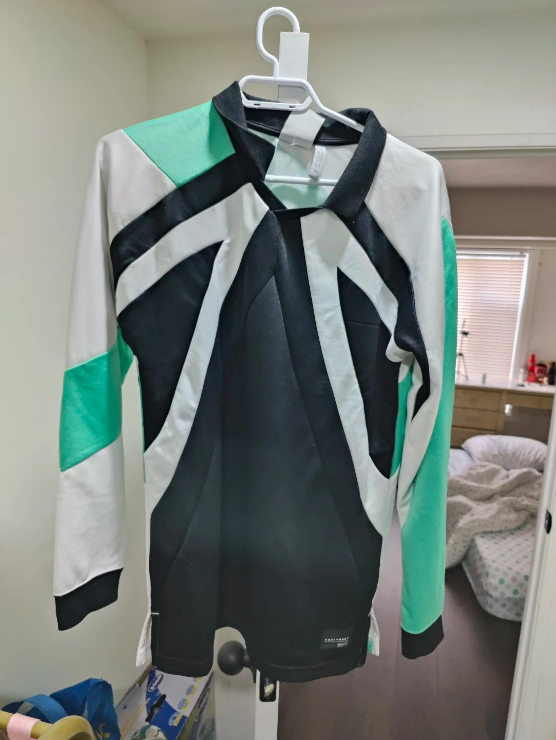 Selling an Adidas long sleeve top with a unique colour block design! The shirt features a stylish combination of black, white, and mint green. It's in great condition and perfect for adding a sporty touch to your wardrobe