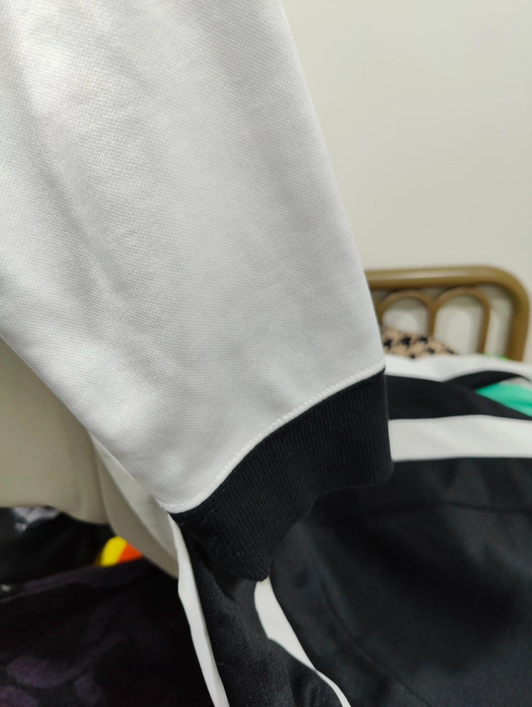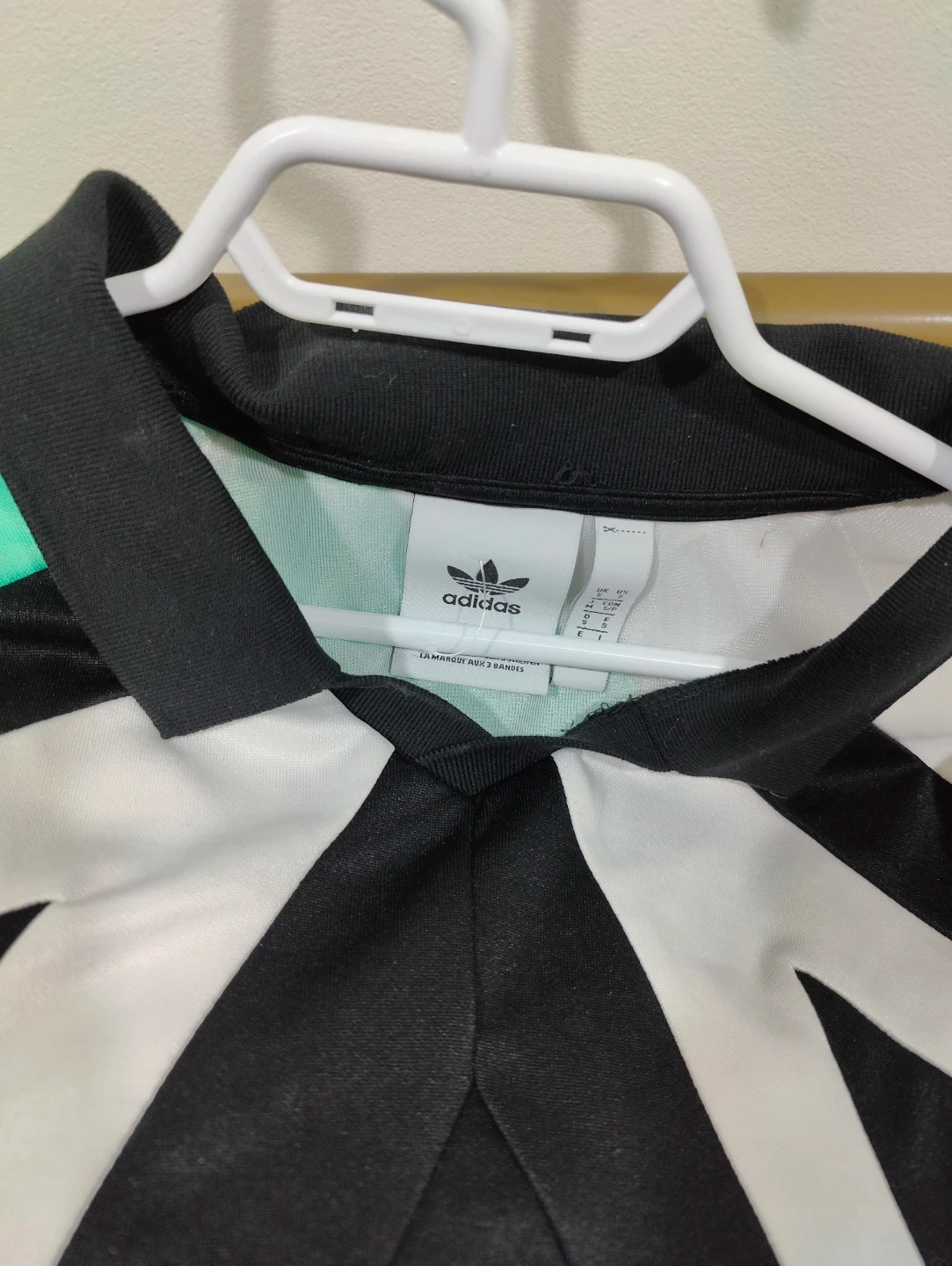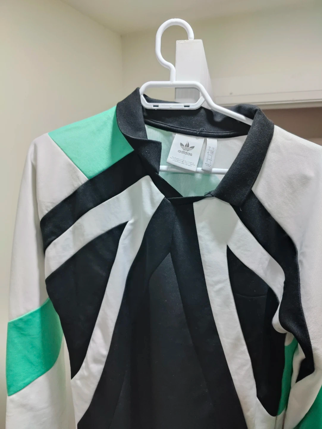 Selling an Adidas long sleeve top with a unique colour block design! The shirt features a stylish combination of black, white, and mint green. It's in great condition and perfect for adding a sporty touch to your wardrobe