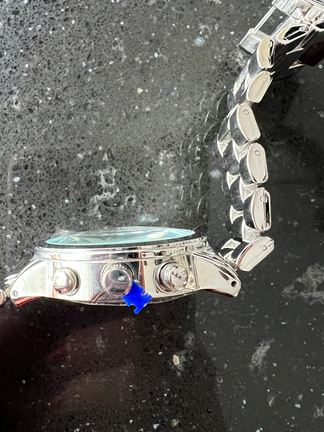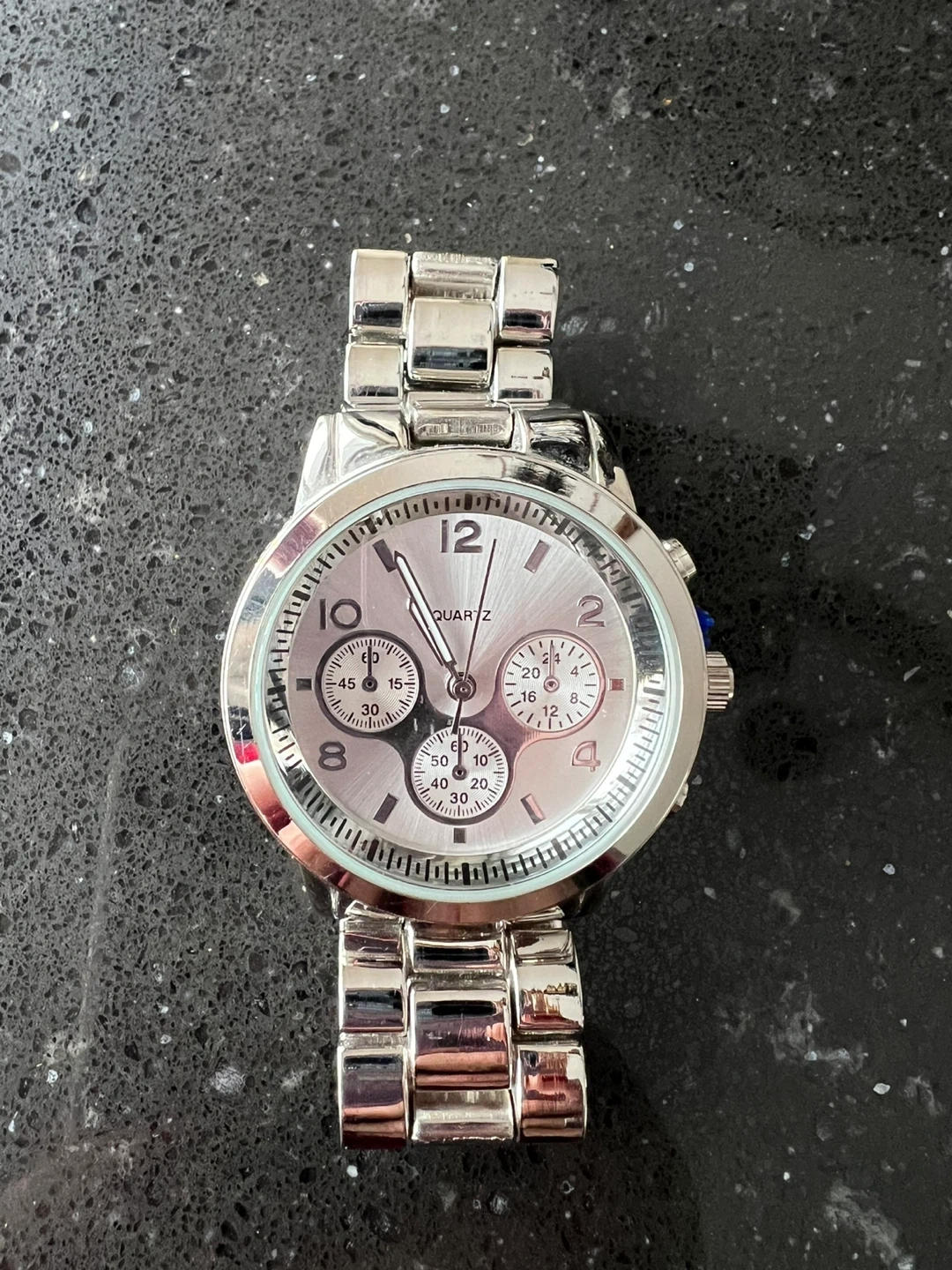 Selling a silver-tone wristwatch. It's a quartz movement watch with a stainless steel back and metal bezel. A stylish accessory for any outfit!