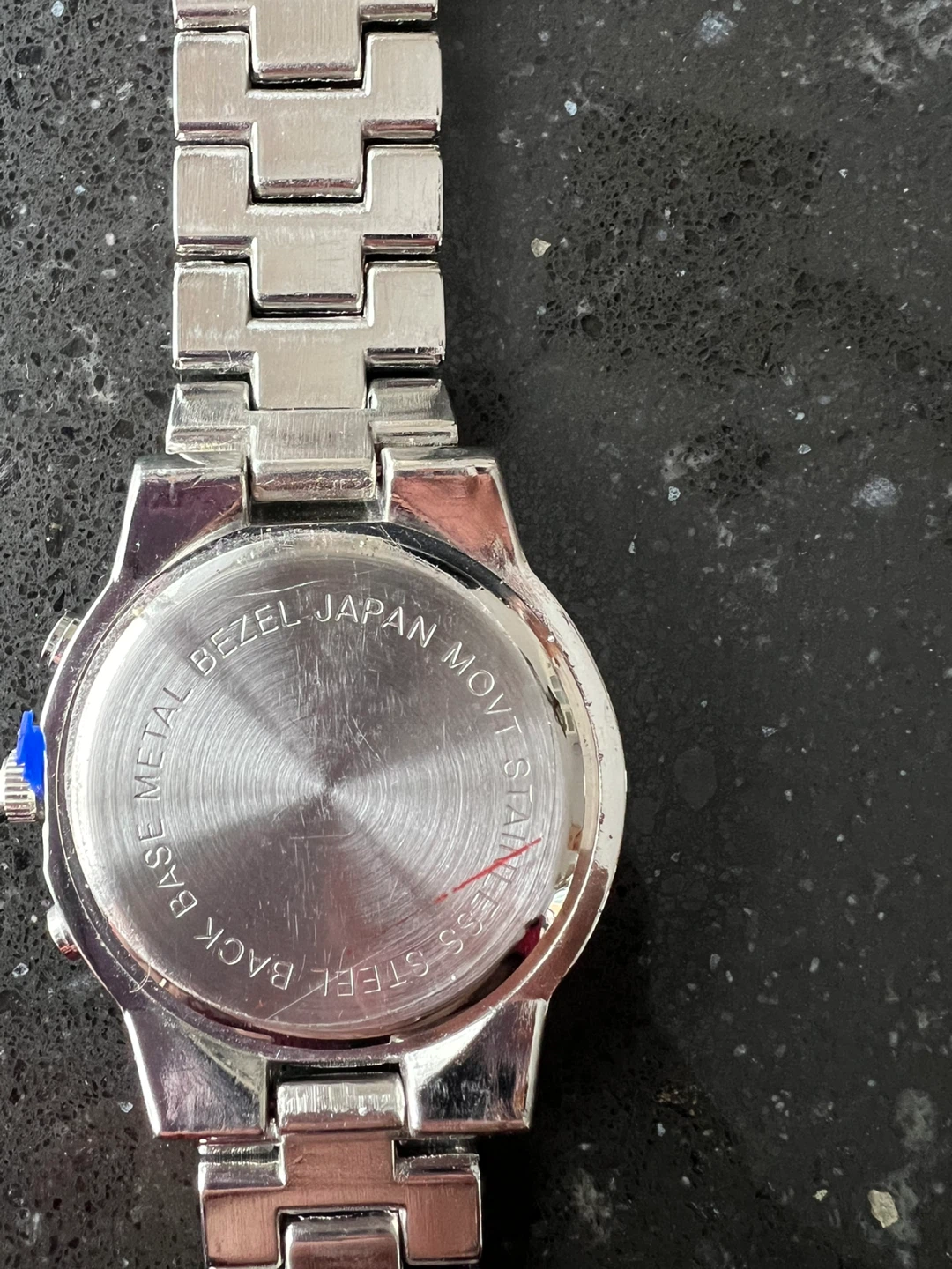 Selling a silver-tone wristwatch. It's a quartz movement watch with a stainless steel back and metal bezel. A stylish accessory for any outfit!