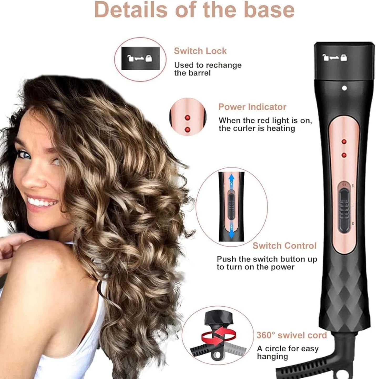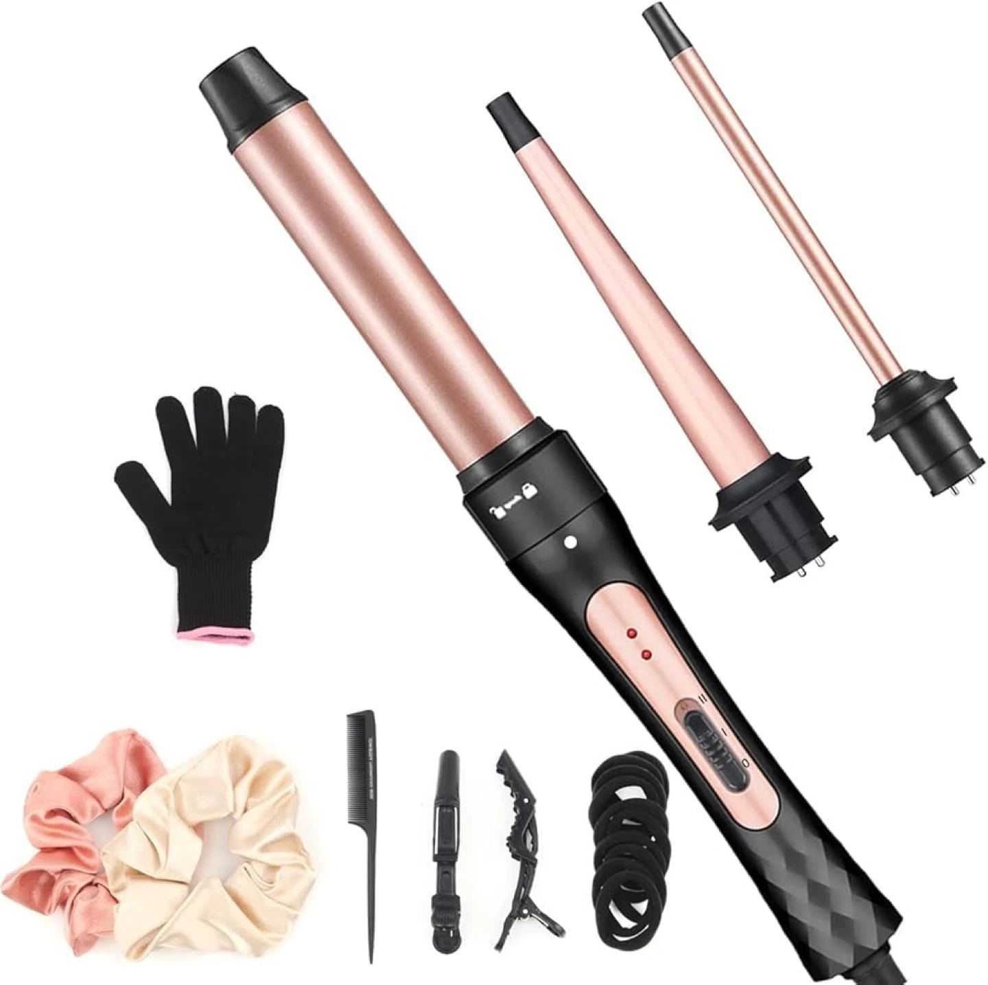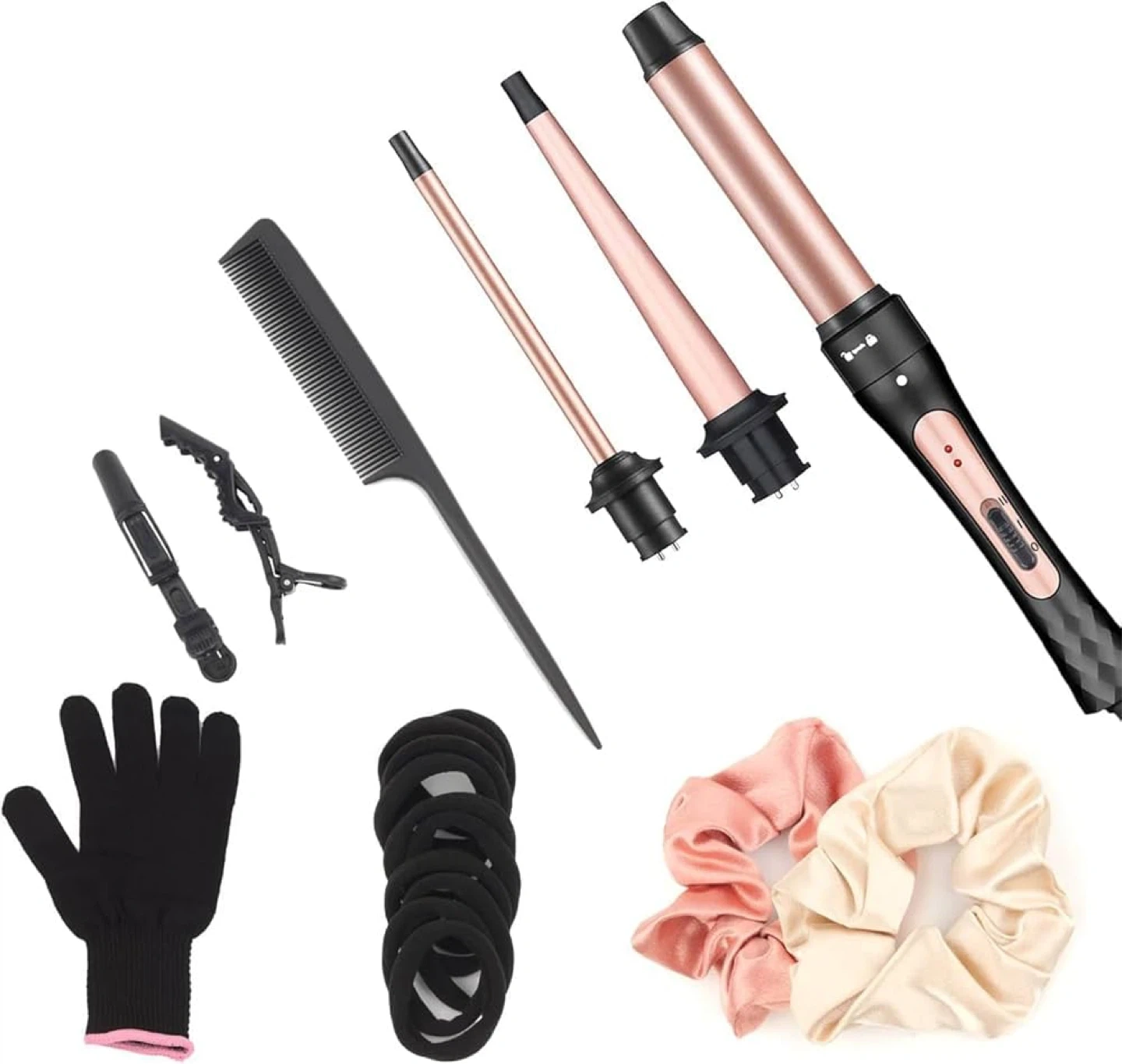 This curling wand set includes a main handle and five interchangeable barrels for versatile styling. It comes with a heat-resistant glove, comb, clips, and scrunchies. Features include a switch lock and power indicator for safe and easy operation.