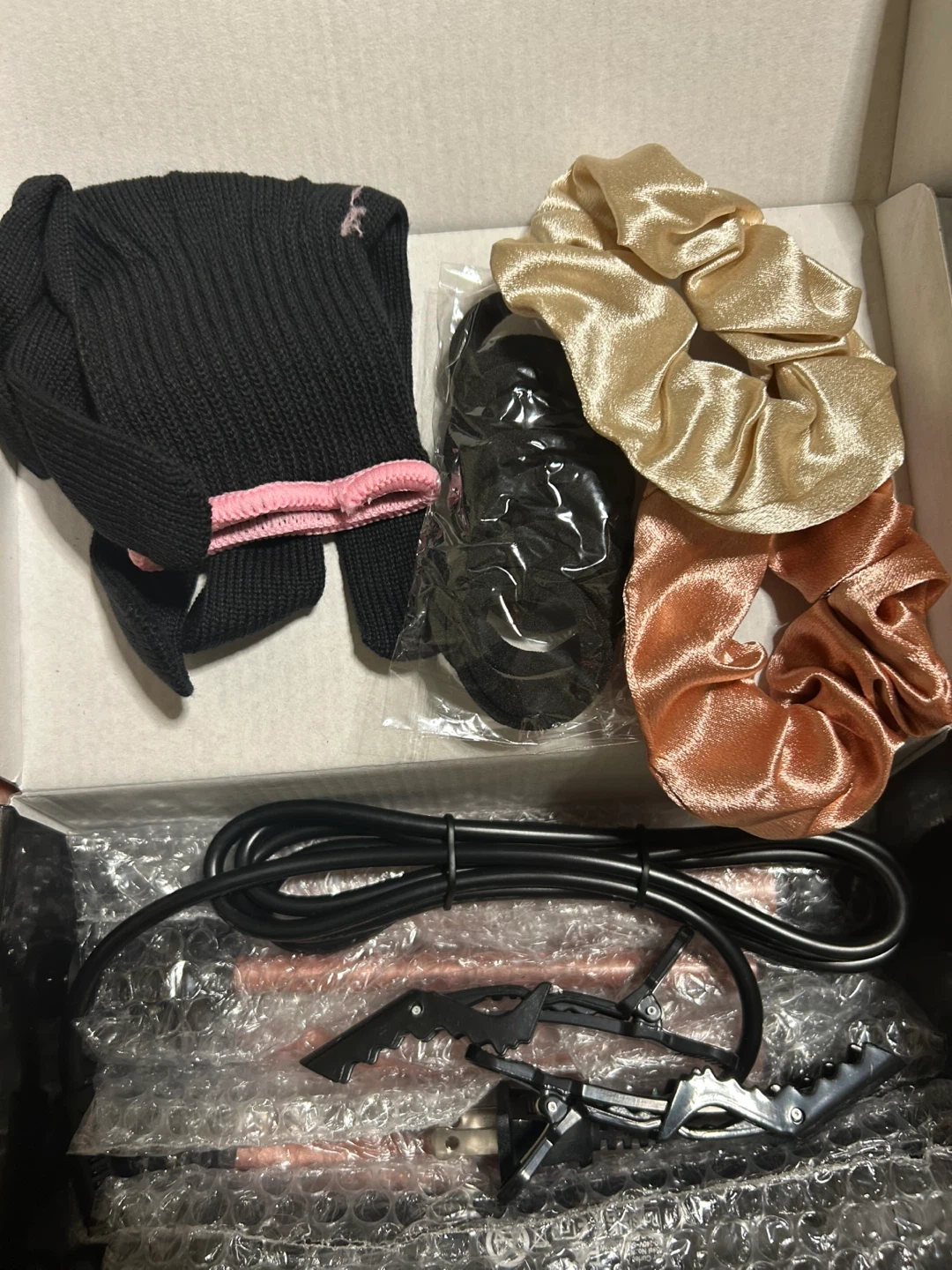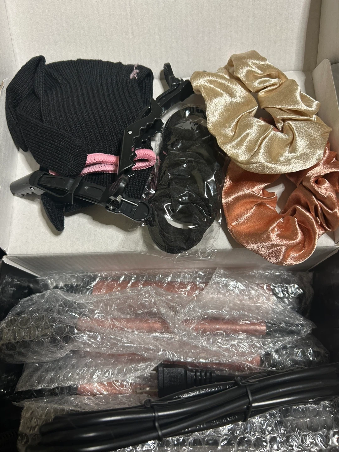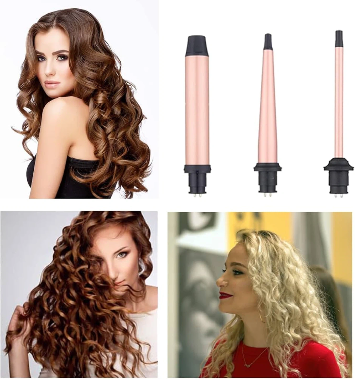 This curling wand set includes a main handle and five interchangeable barrels for versatile styling. It comes with a heat-resistant glove, comb, clips, and scrunchies. Features include a switch lock and power indicator for safe and easy operation.